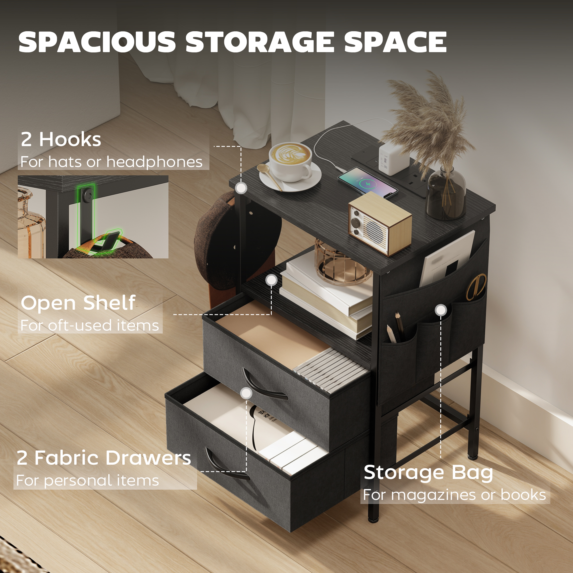 Tangled cords and clutter can disrupt the calm of your evening routine, making it hard to truly relax. Imagine your devices dying overnight and essentials scattered with no home. This HOMCOM side table with storage restores order, integrating power sockets and USB ports to keep you connected. Its five-part storage system, including drawers and a handy side pocket, provides a dedicated place for every item, ensuring your personal space remains a tranquil, organised retreat.