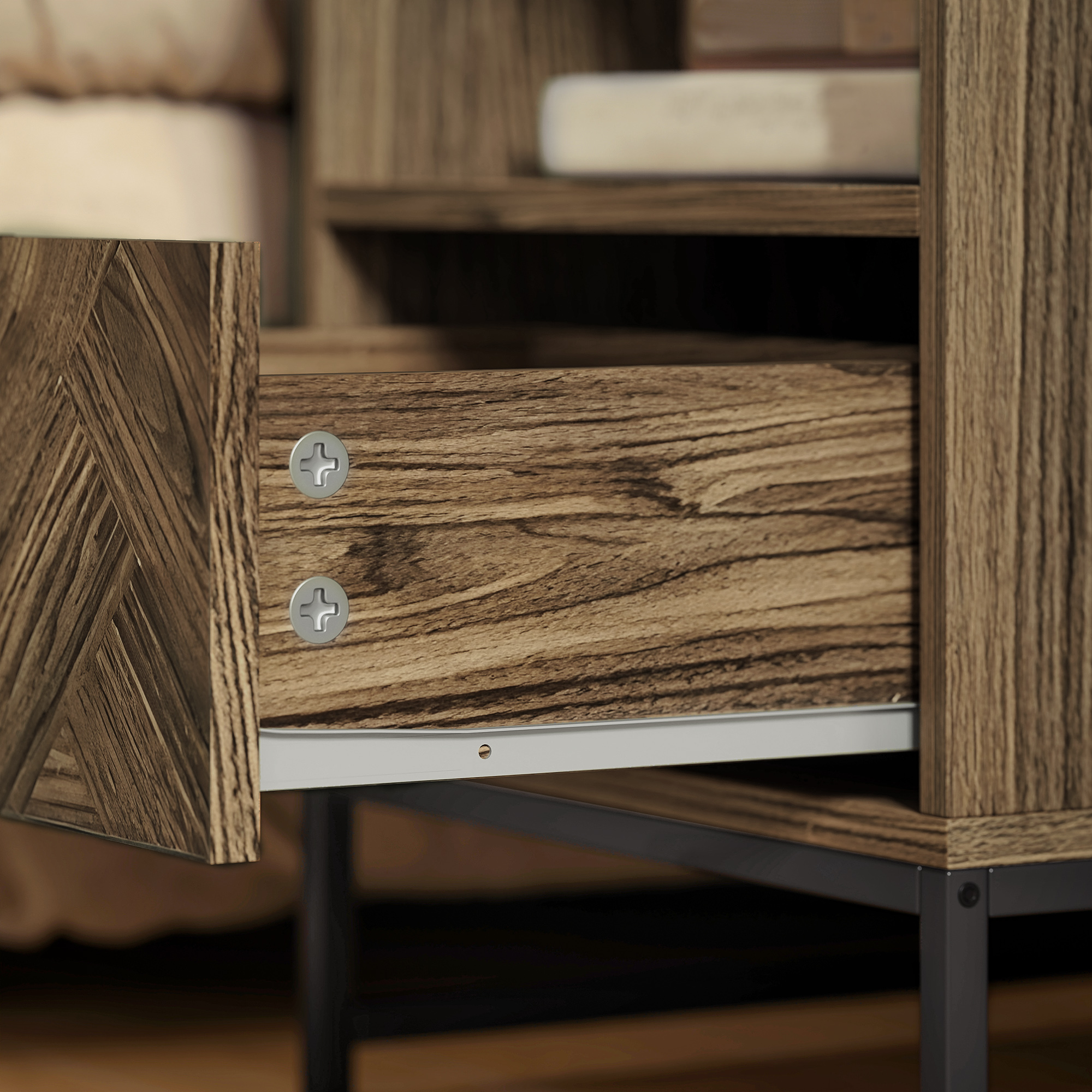 Need some more storage in your bedroom or other living areas? This HOMCOM end table is here to help. The brown colour with black steel frame puts a new spin on the Industrial-style trend; looks great. The drawer and open shelf offer plenty of storage room. Use it as a night table beside your bed or just as an end table in the living room. Steel base offers plenty of support.