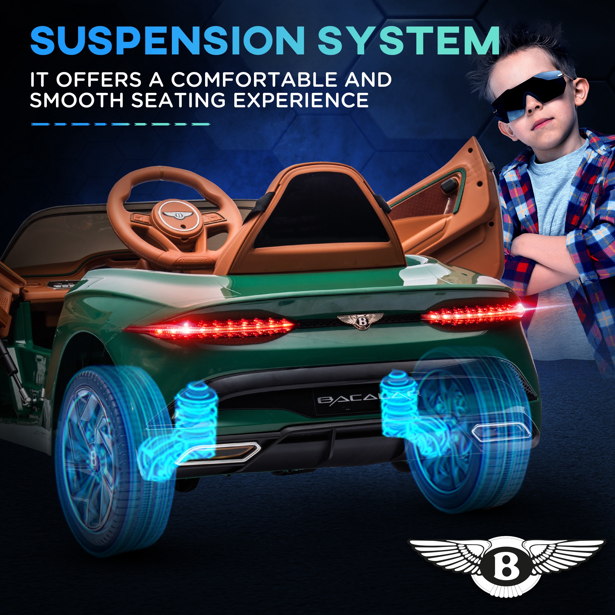 Fuel your child's imagination with this HOMCOM kids' electric ride-on car. Designed to amaze and excite, it's an officially licensed Bentley Bacalar; a sleek look with butterfly doors. Like a real car, they'll have music, a horn and lights to play with, adding realism to make-believe games. Safety is the first priority – the wide wheels, shock-absorbing suspension system and seatbelt ensure this. There's even a remote control for adults to control the ride-on, so everyone can join the fun.