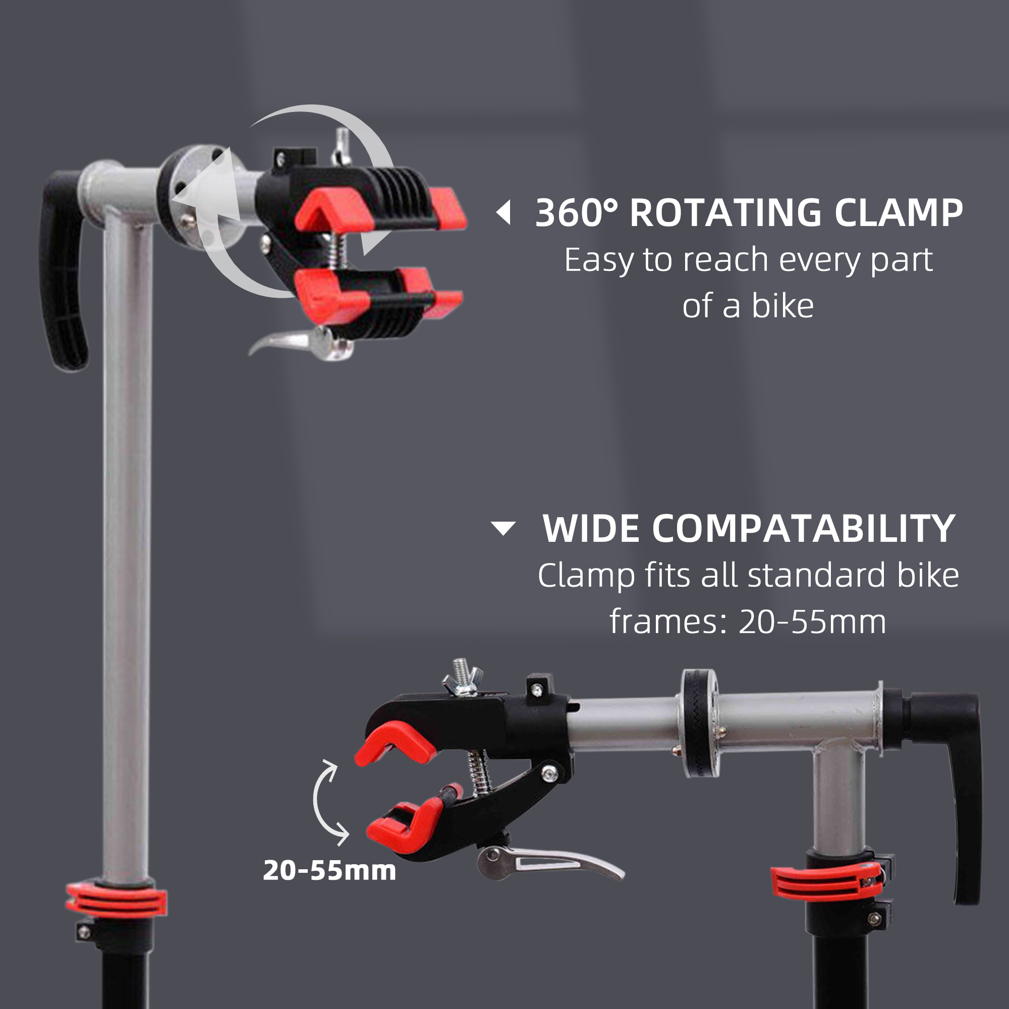 - Clamp fits most standard frame diameters from approx. 20-55mm