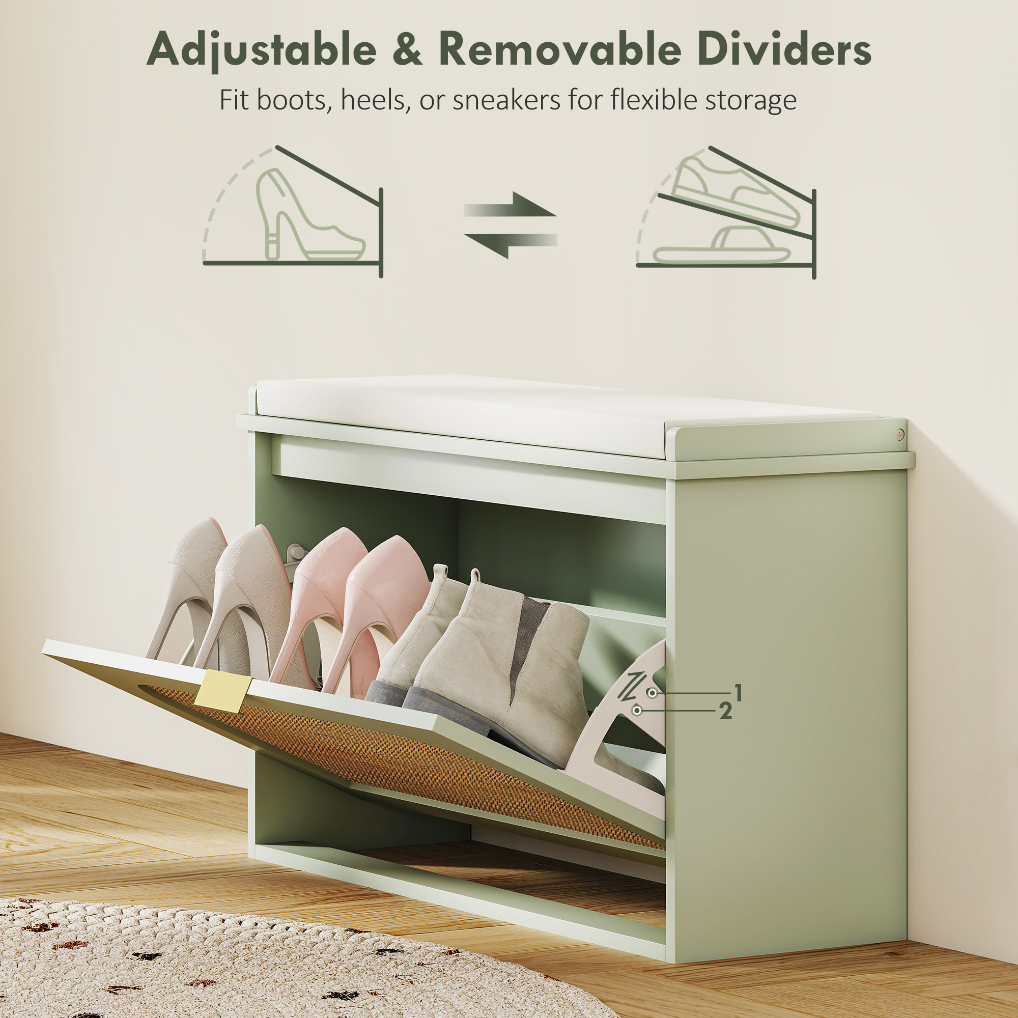 Step into a serene entryway with the HOMCOM shoe storage bench. Tired of clutter? The flip door and double shelf design offer effortless organization, keeping your shoes neatly arranged. Imagine the comfort of a thick cushion as you change shoes, with a breathable linen-feel fabric surface ensuring cleanliness. The rattan door adds a boho touch, enhancing your home's inviting atmosphere.