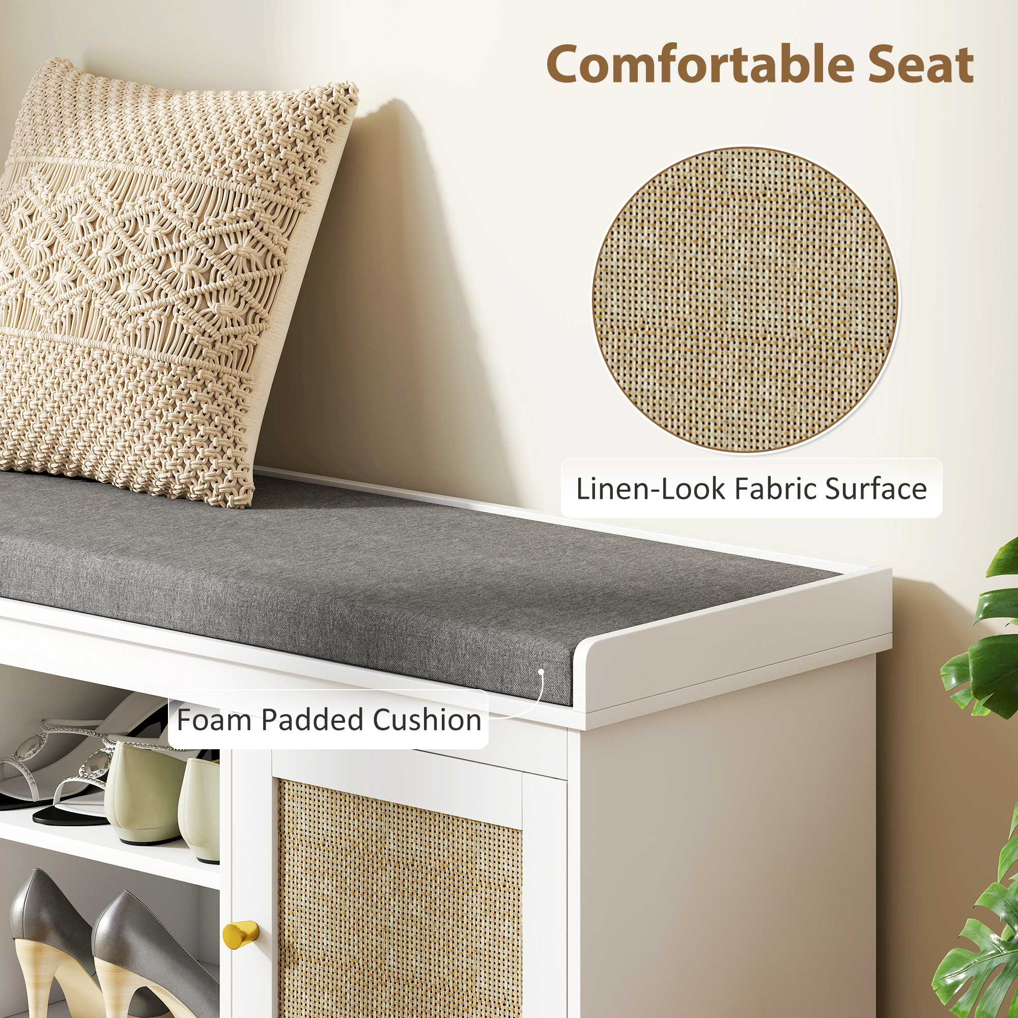 Step into style and functionality with the HOMCOM shoe bench. This boho-chic entryway bench features rattan accents and gold tone handles, adding a touch of elegance. Enjoy the comfort of a foam-padded cushion with a breathable, washable linen-look fabric. Great for organising, it holds up to nine pairs of shoes with its spacious two-tier cabinets and adjustable shelves. A charming solution for any home!