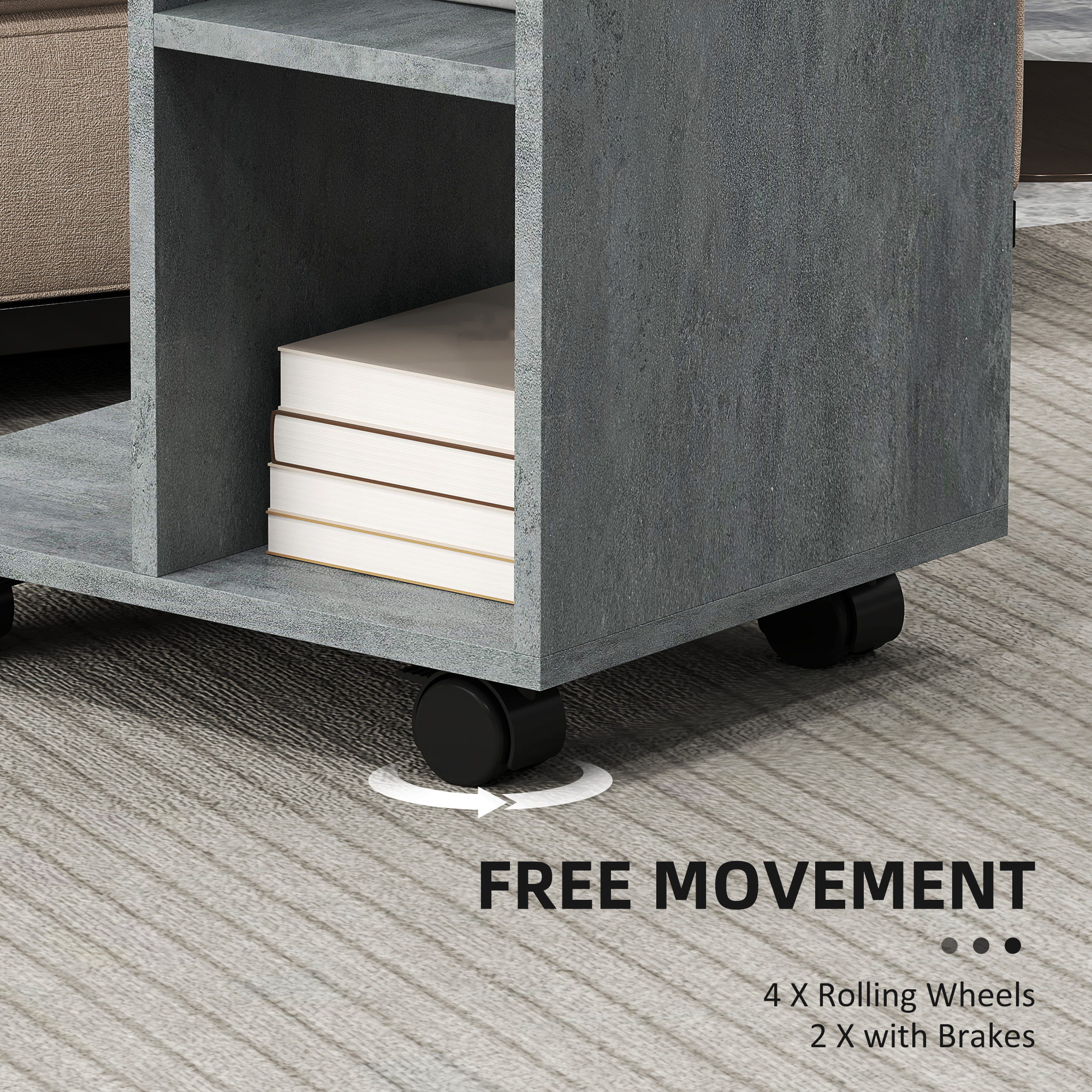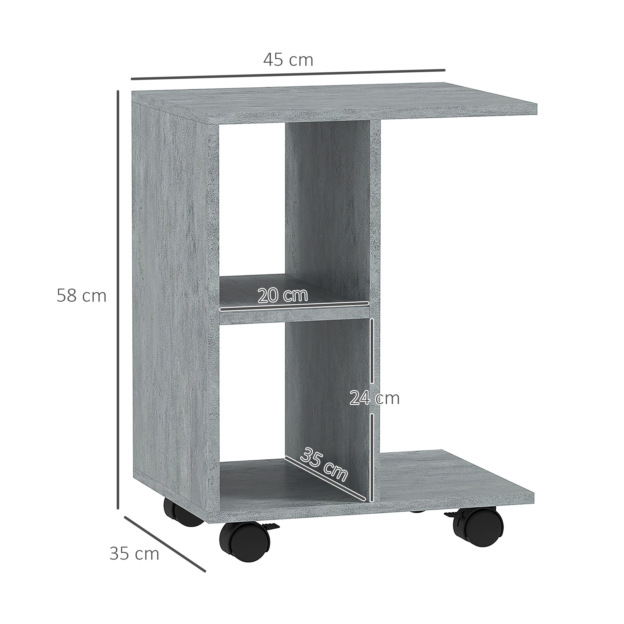 Let the unique design of this 'C' table, from HOMOM, lead the way for keeping your home tidy. Featuring two open shelves for storage and display. The open end can be used as both extra storage and slotting into spots to extend the surface space, with the four wheels allowing it to move easily; two can be locked to keep the table in place. It's finished with a melamine coating, making it smooth, protected against light markings and easy to clean.