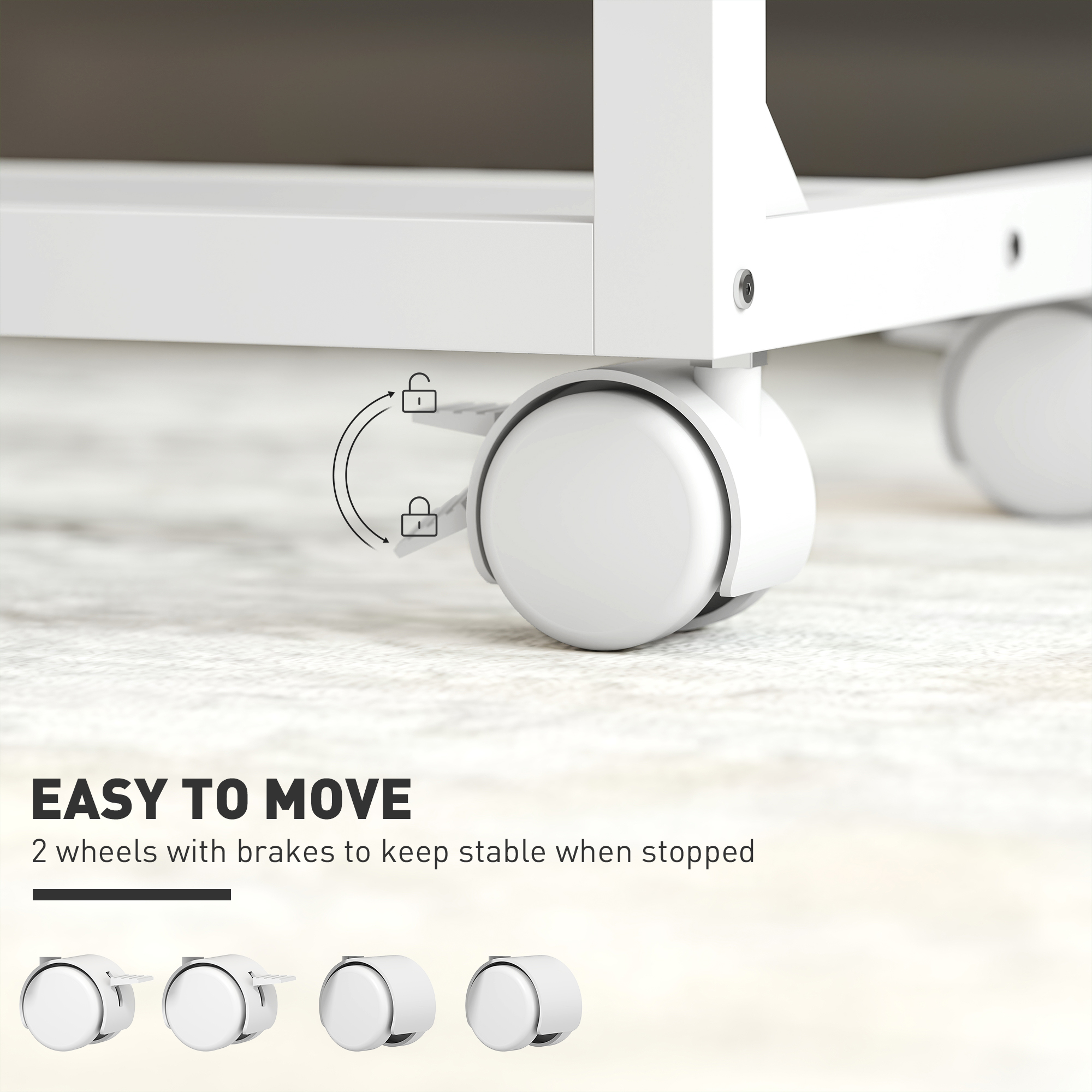 - Four casters, two with brakes, enhance mobility and stability