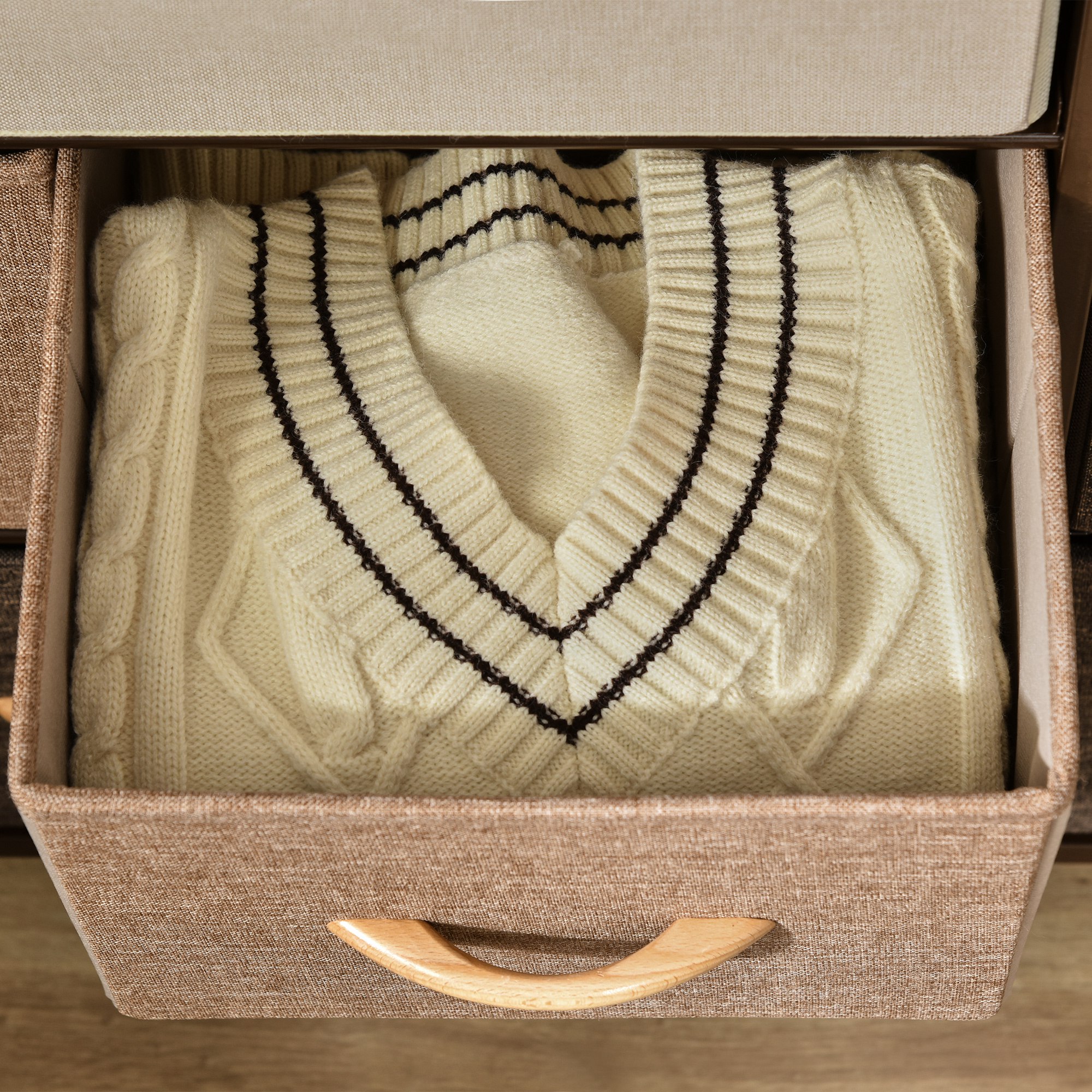 - Linen-feel drawers can be removed and folded. Comes with handle to open and close