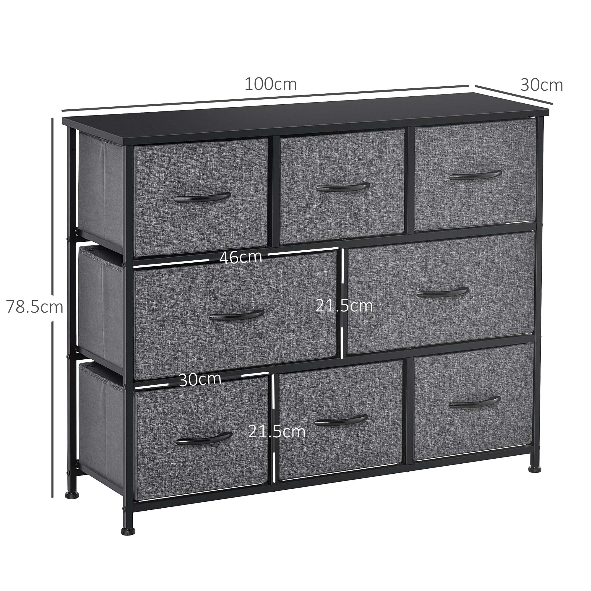 This HOMCOM bedroom chest of drawers features a versatile neutral colour palette, making it a great addition to any home. With eight spacious drawers—six small and two large—it provides lots of storage for clothing, accessories and more, helping you stay organised. The robust steel frame ensures a supportive structure, while the anti-tipping design enhances safety, making it a reliable choice for any room.