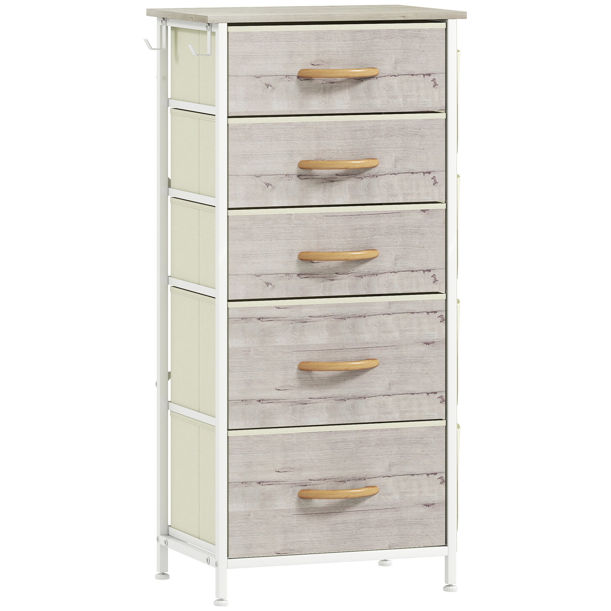 Easy, simple storage with this HOMCOM fabric chest of drawers. With three small and two large drawers, it's easy to sort everything from socks to pants. It also features four side pockets and two hooks to get smaller accessories altogether. A steel frame with X-bars keeps this bedroom dresser stable, finished with adjustable feet for balance - even on unsteady grounds.