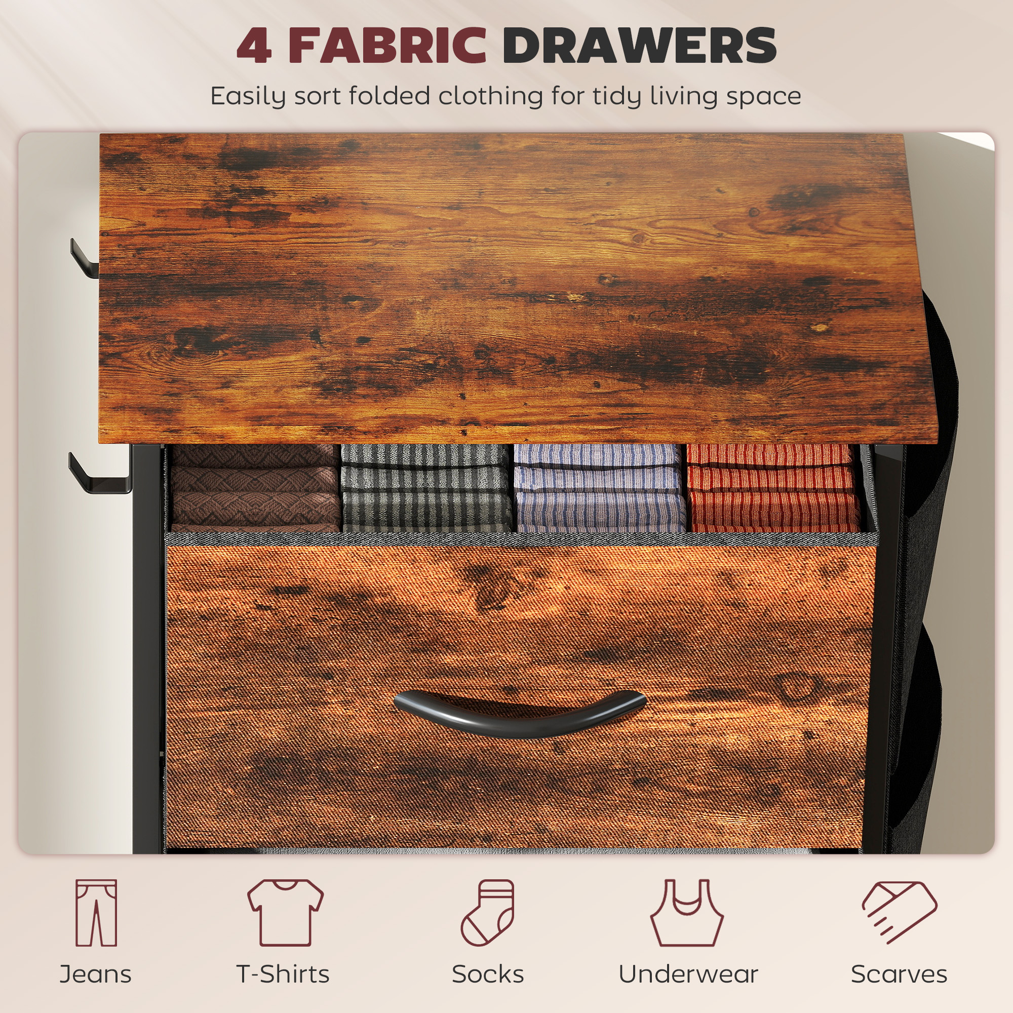 Easy, simple storage with this HOMCOM fabric chest of drawers. With four same drawers, it's easy to sort everything from socks to pants. It also features four side pockets and two hooks to get smaller accessories altogether. A steel frame with X-bars keeps this bedroom dresser stable, finished with adjustable feet for balance - even on unsteady grounds.