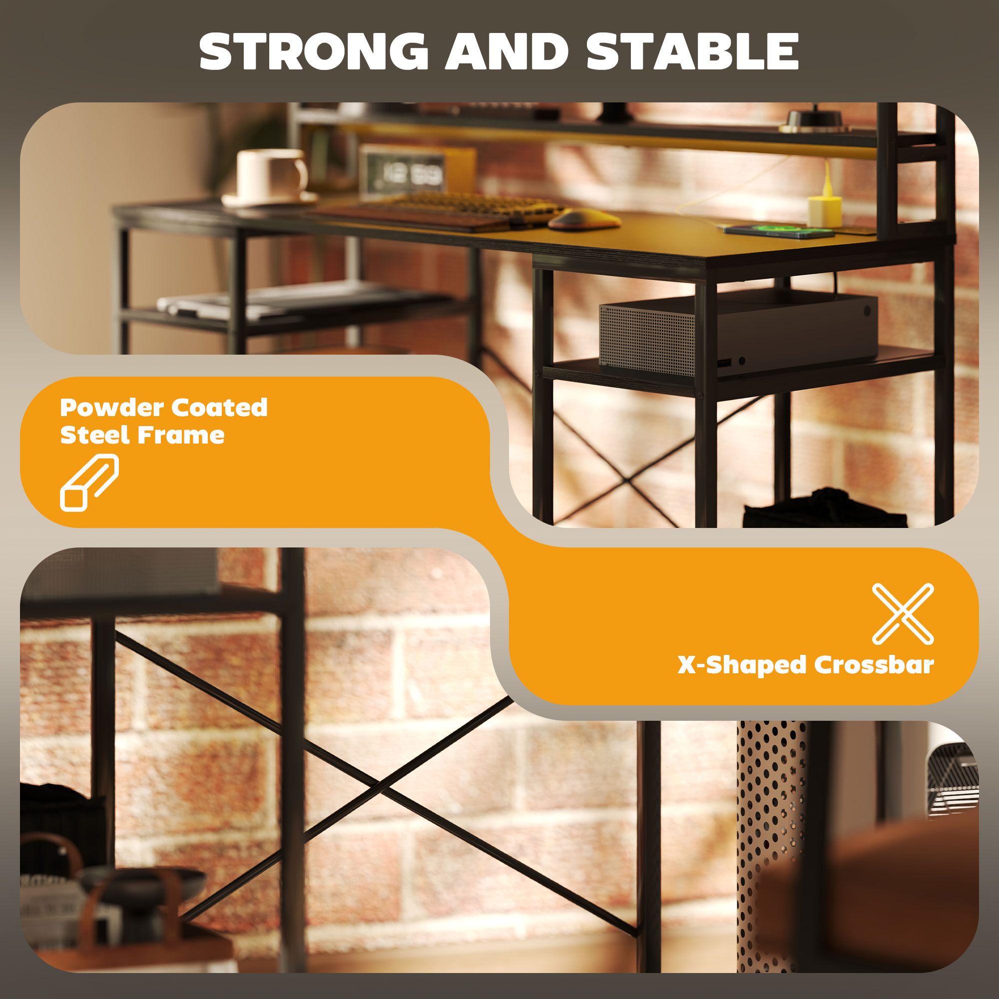 - Fixed shelves, a hutch and CPU stands offer additional storage