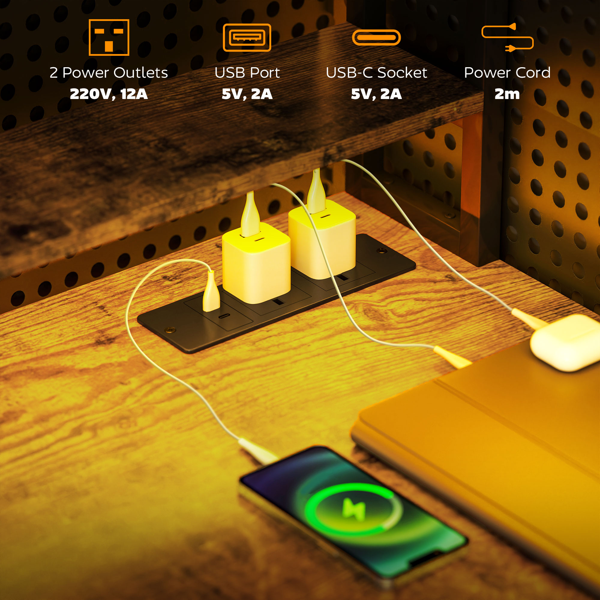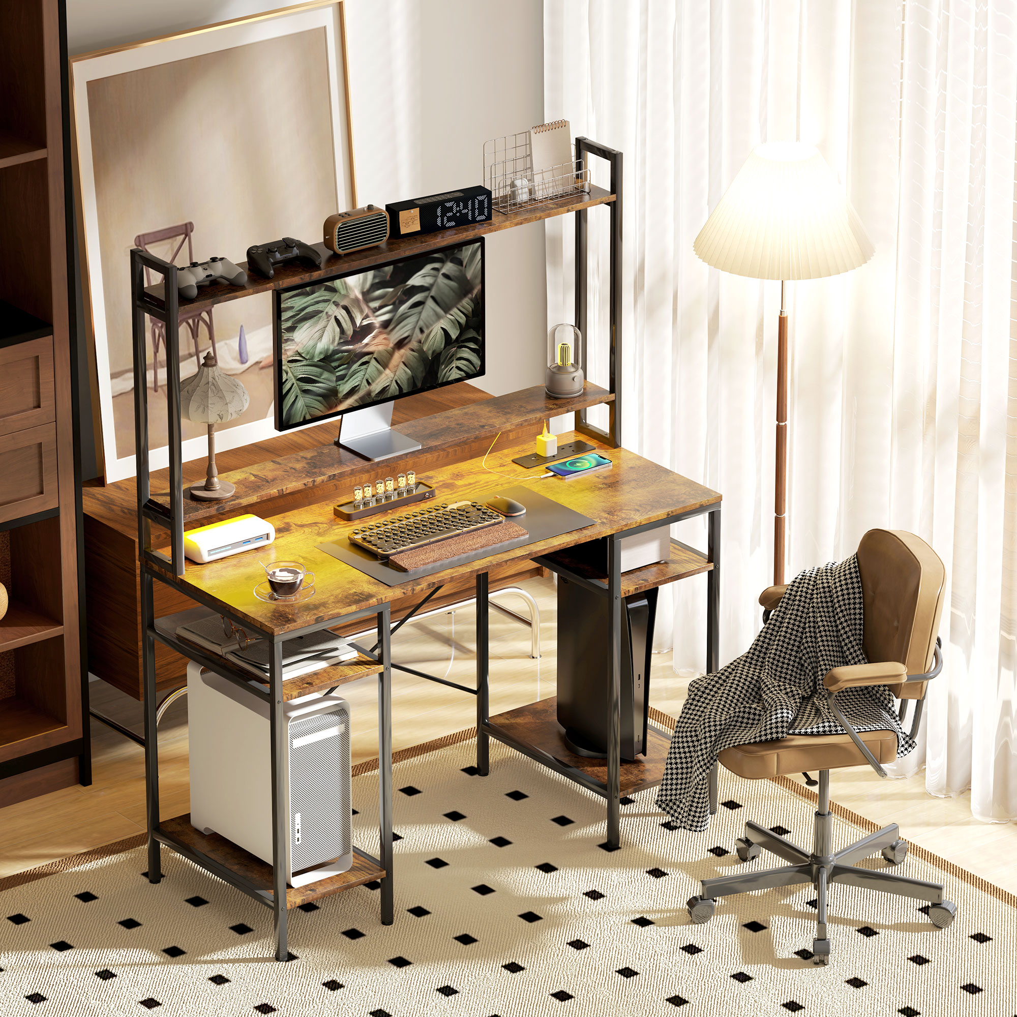 Transform your workspace with the HOMCOM computer desk with storage, designed for both style and functionality. It features a built-in charging station with two power outlets and two USB ports, keeping your devices powered up and organised. Customise the ambiance with RGB LED lights and enjoy the ergonomic monitor stand that promotes comfort with lots of storage options, including shelves and CPU stands. This HOMCOM writing desk helps you keep your home office or study area tidy and efficient.