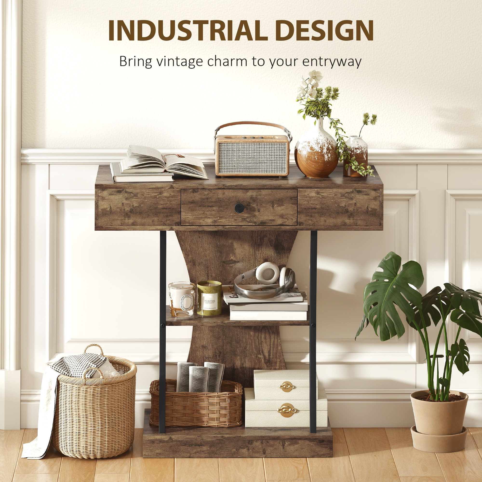 Tired of a cluttered, uninspiring entryway? A messy first impression can make your whole home feel chaotic. This HOMCOM console table with storage transforms your space. Its bold industrial design and vintage-style shelves make a statement. Tabletop, two open shelves and a drawer neatly organise your essentials, creating a welcoming and stylish first impression that you and your guests will appreciate every day.
