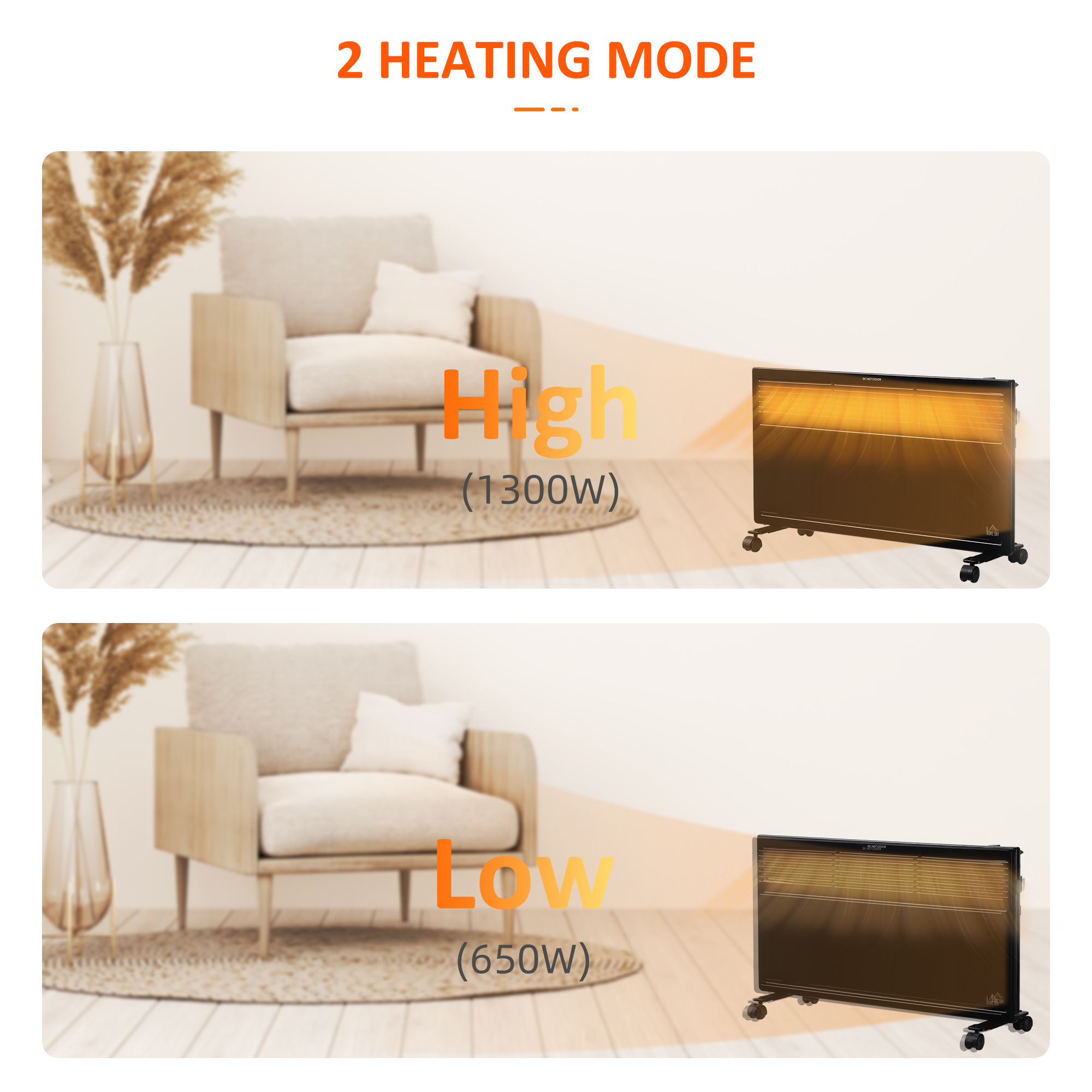 - 650W and 1300W heat setting for different temperatures. 7-35 °C thermostat to keep at a constant temperature