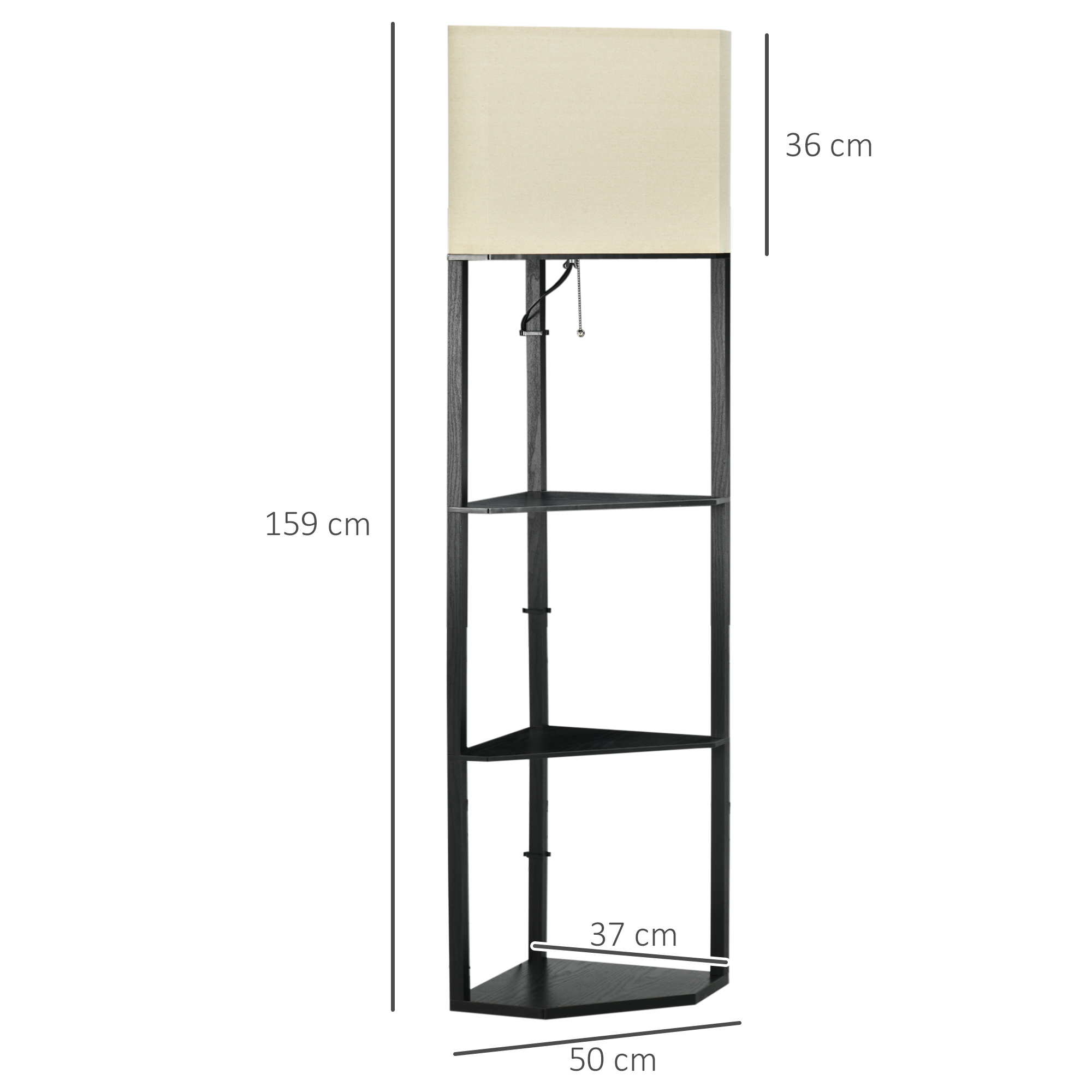 2-in-1 for the home: this shelf floor lamp, from HOMCOM. Combines three shelves and top light - in a triangle design to neatly slot into corners. The top light is easy to operate - pull the chain to turn on/off. Its fabric shade omits a soft glow for a welcoming atmosphere. Three shelves give you plenty of storage room. Now you just need to decide where to put it...