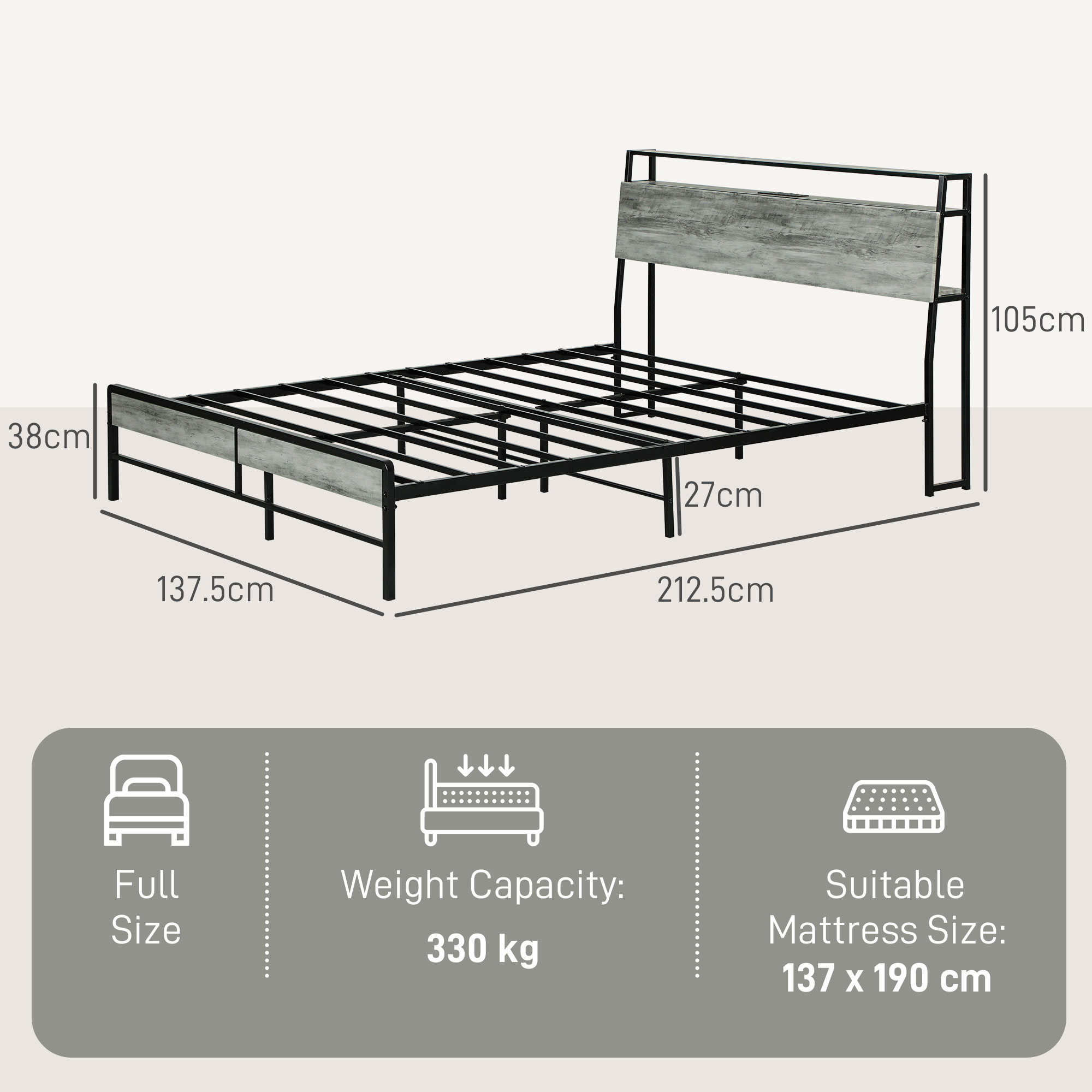 - Headboard Size: 137.5W x 19.5D x 105Hcm