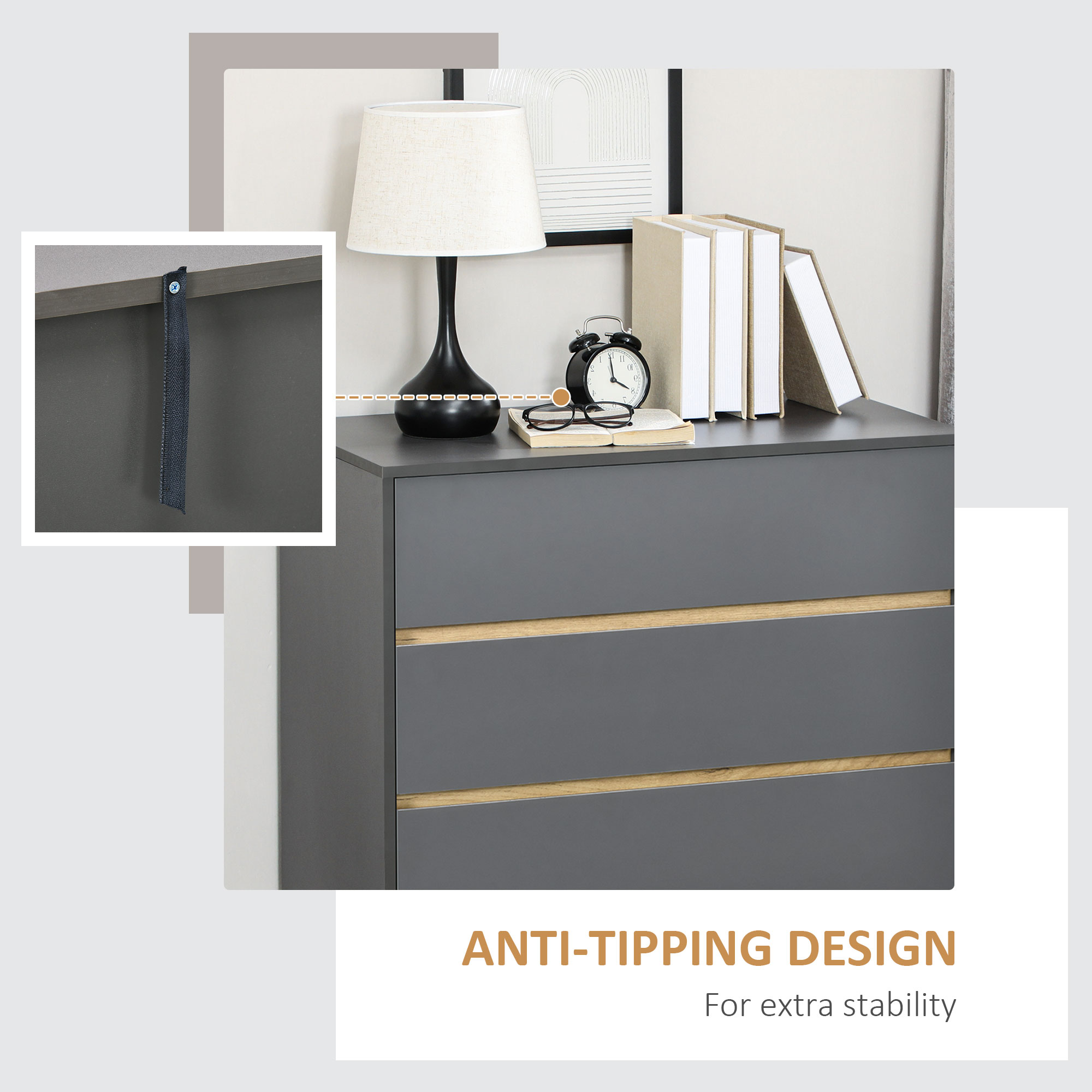 Make a statement, with just a touch of moodiness for the season ahead: look to this HOMCOM bedside dresser. It comes in a dark matte grey colour, with wood-effect details bringing a touch of the natural. Comes with three drawers - room for keeping bedside essentials stored - as well as other places in the home. Complete with wooden legs for support and anti-tipping straps for safety.
