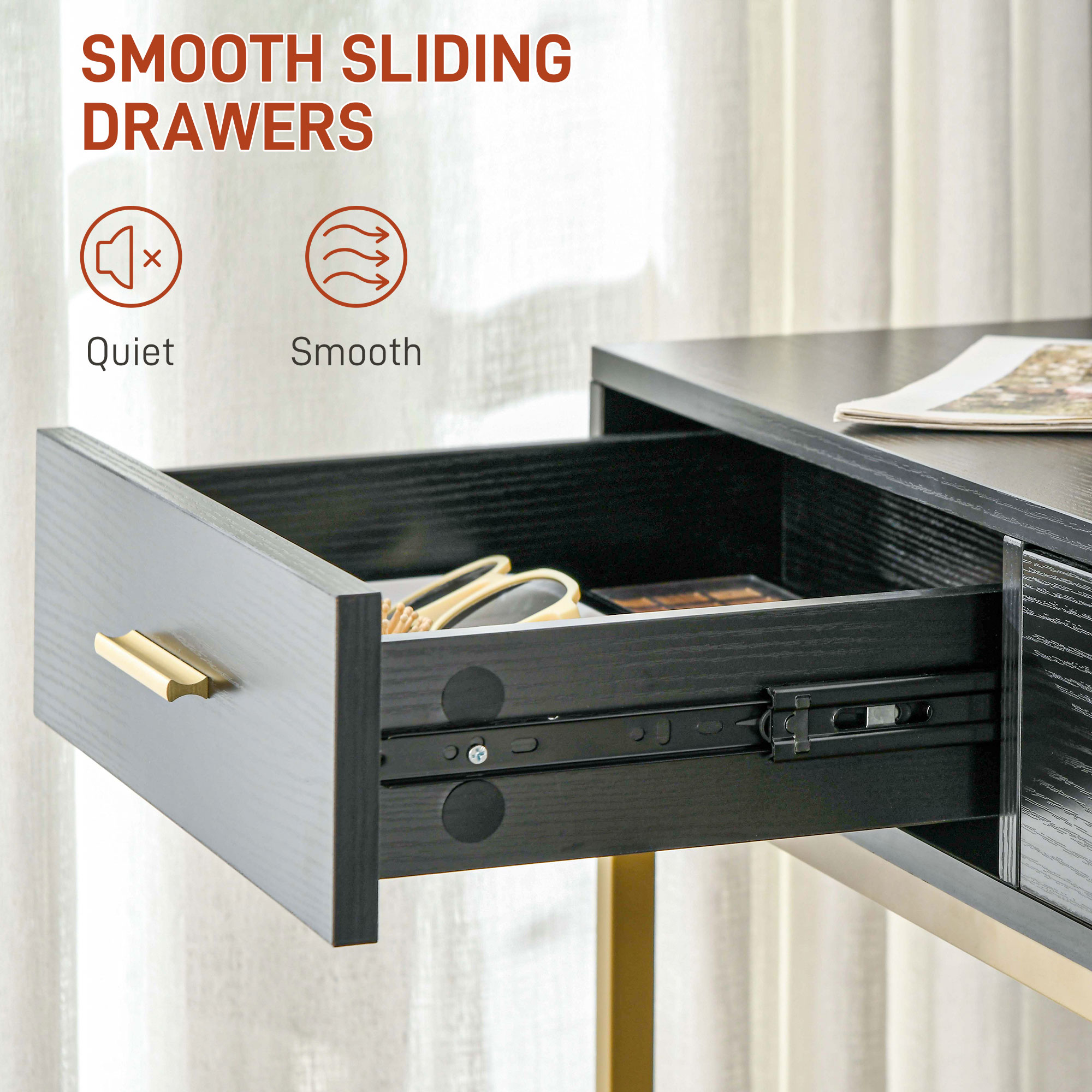 - Smooth sliding drawers are quiet