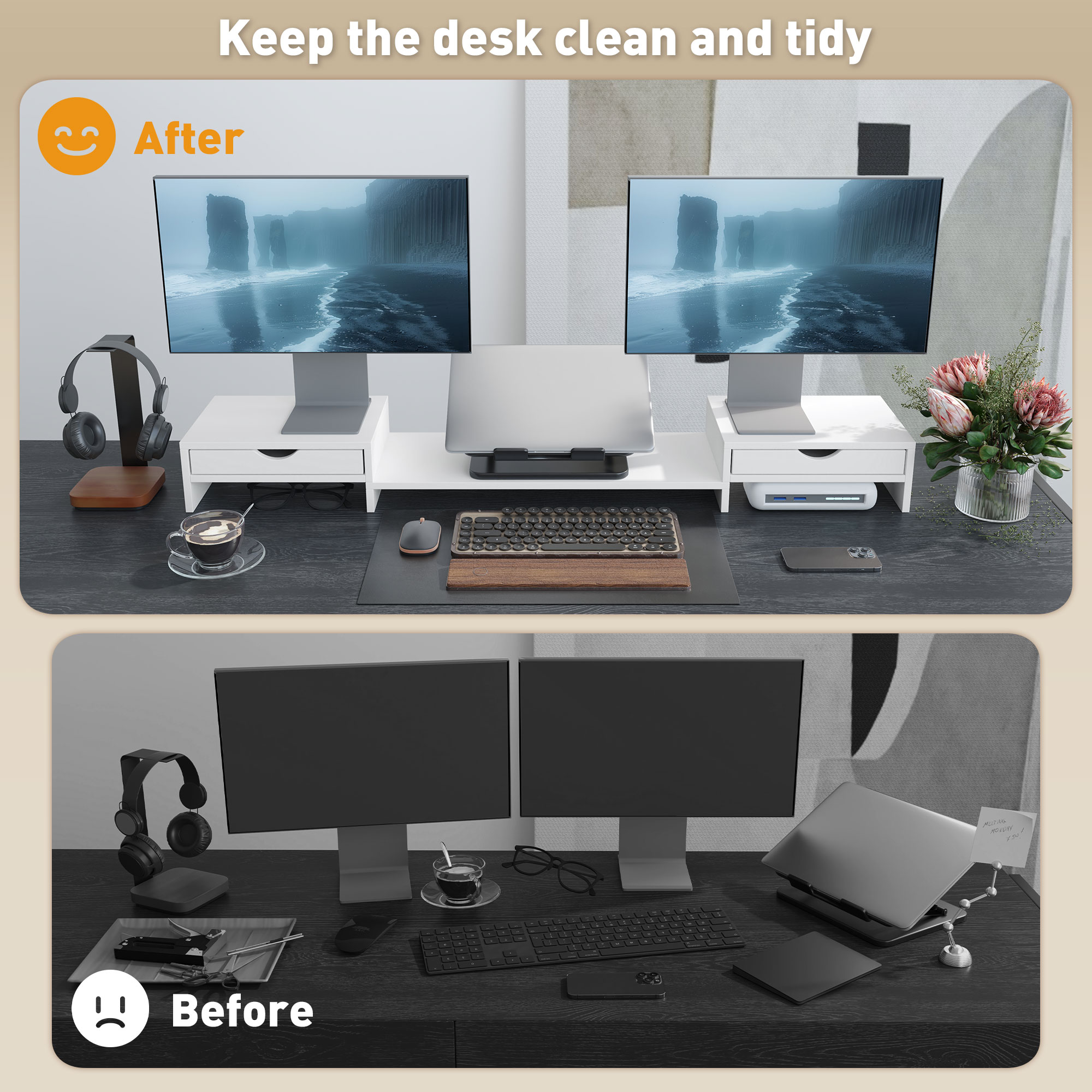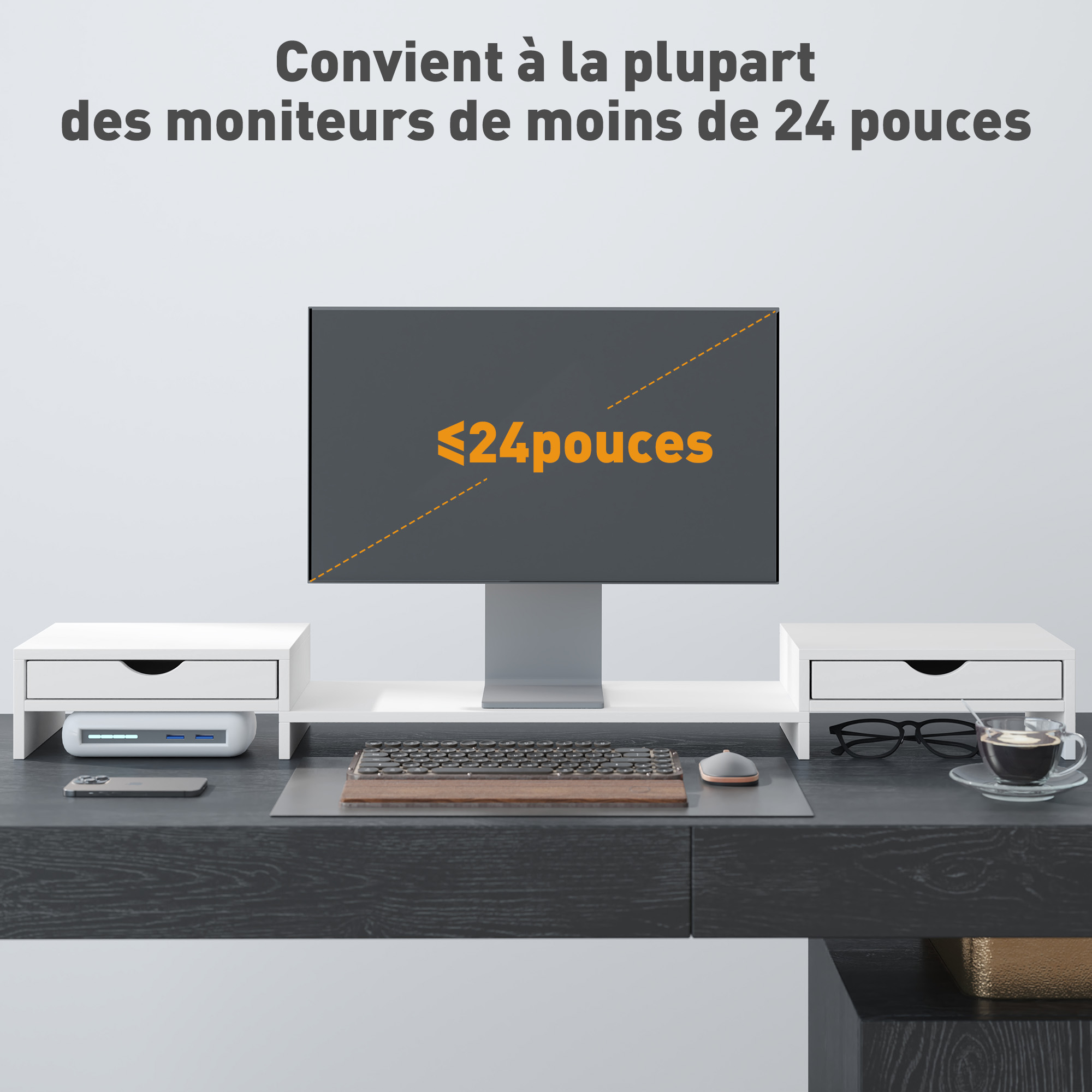 Elevate your viewing with the HOMCOM monitor stand with drawer, designed to lift your monitor to eye level for optimum comfort. This nifty monitor riser stand extends from 60-116cm to accommodate the placement of two monitors and adjusts angles to your liking, maximizing desk space with cleverly integrated drawers and storage compartments for keyboards and mice. Suitable for screens up to 24", it's a space-saver that tidies while it elevates!