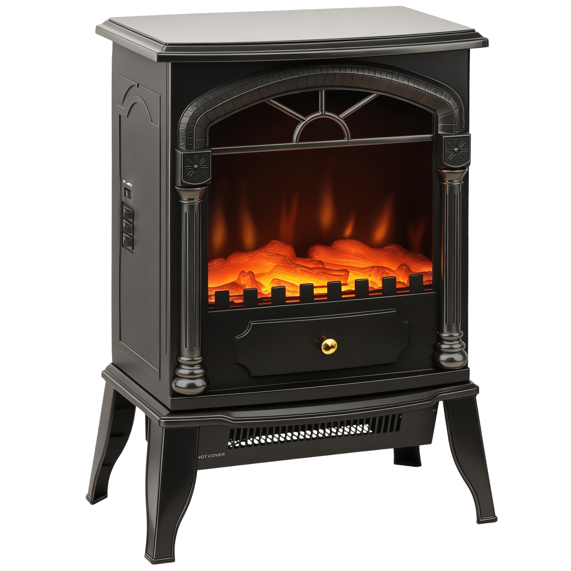 - Realistic 3D flame shines through glass window, creating cosy atmosphere