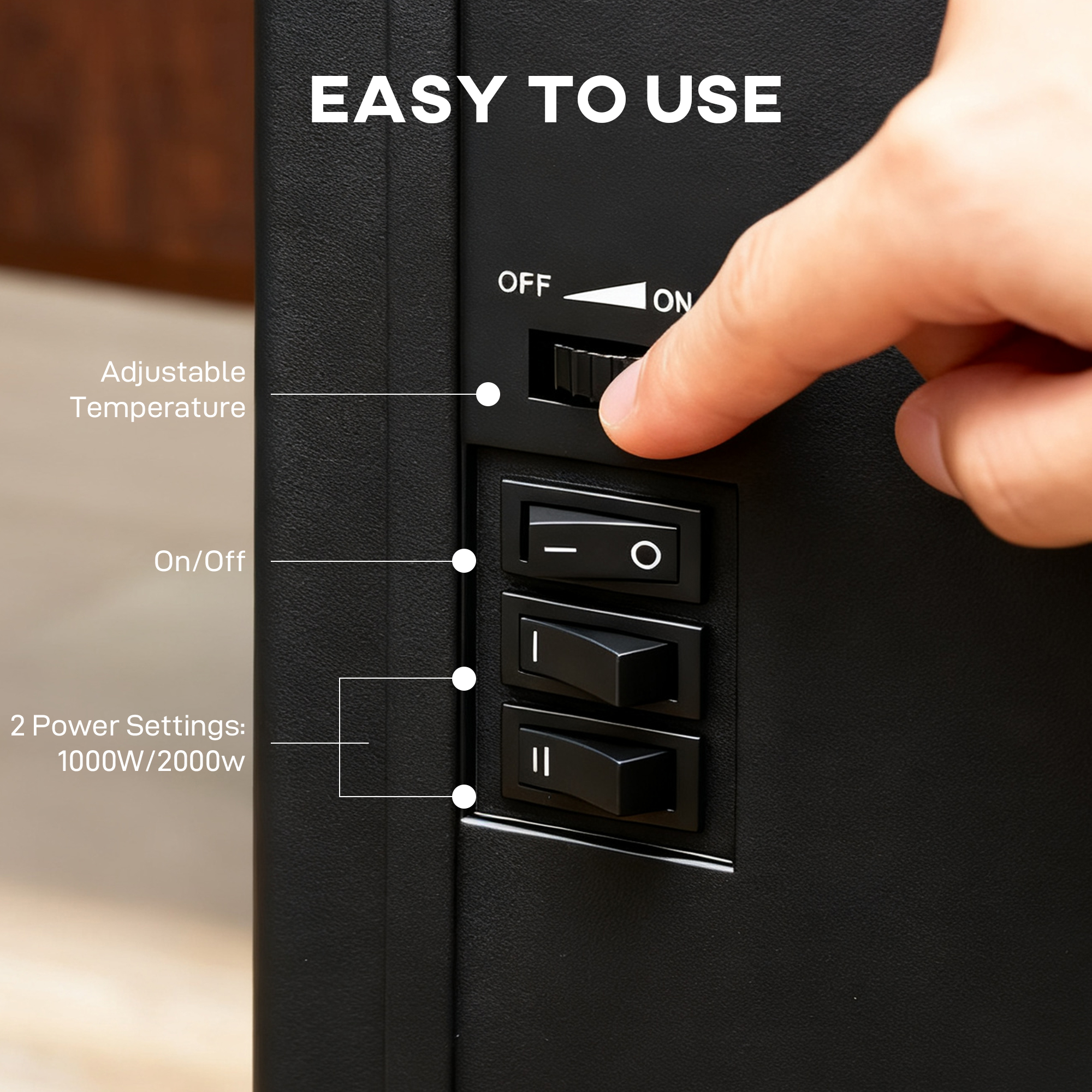 - Two heat settings (1000/2000W) efficiently warm rooms up to 30 m²