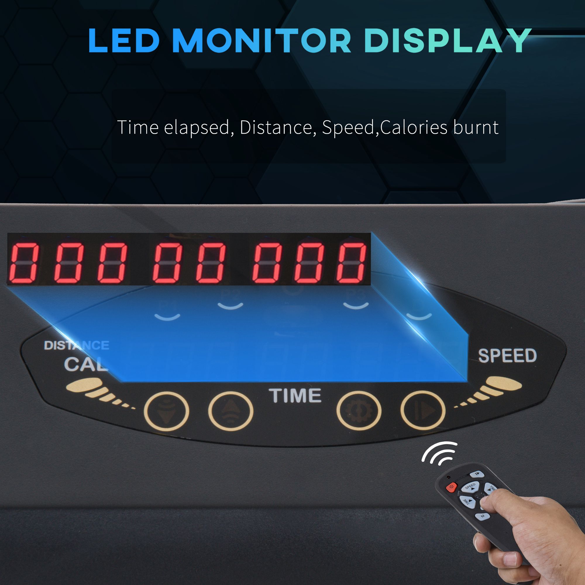 - LCD screen on the front displays time elapsed, distance, speed and calories burnt