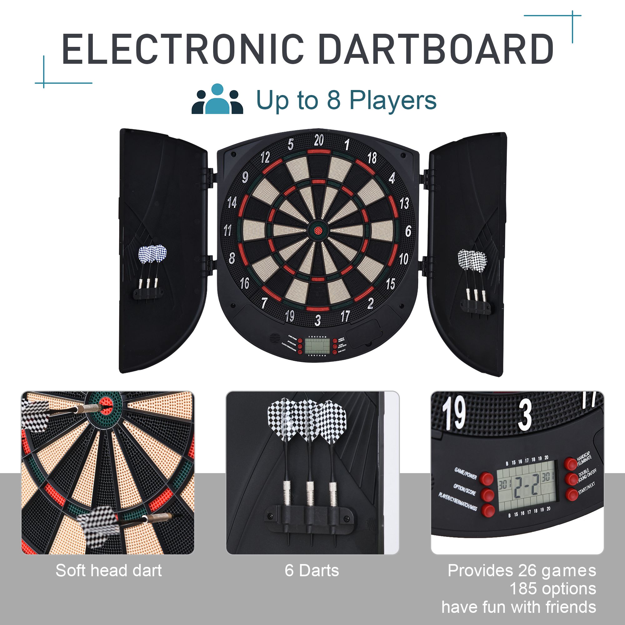 This HOMCOM LCD dartboard is intelligently designed made of sturdy materials though with certifications to let you play at home with family numbers. A large catch ring surrounds the target face creating an extra-large zone for any missed shots, protecting your home from any damage. the side door is equipped with dart holsters that can store and display darts, 6 darts include the set. The side door can keep them on display and safe. Clear and bright LCD display the scoring, language tips also include the volume can be adjustable. Take me home enjoy the game as a victor.