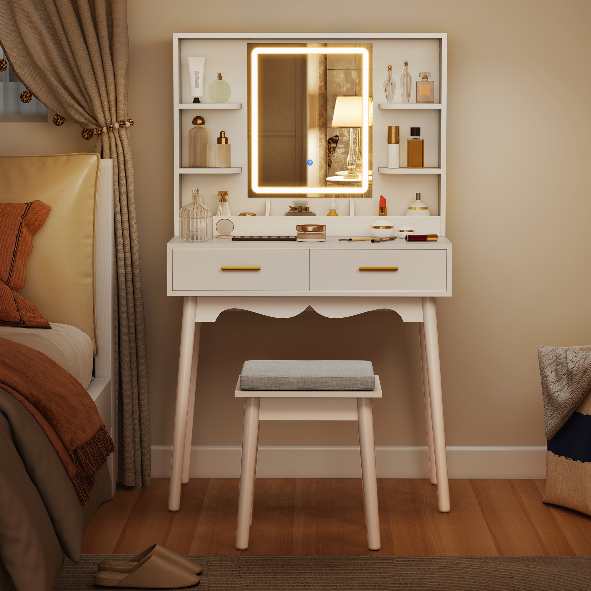 Whatever the time of day, it's easy to get ready with this HOMCOM dressing table. The light is fitted with an outer LED: set the light between the warm, natural or cool white colour, so you'll always be perfectly lighted, no matter the time of the day. It comes in a soft white colour and fitted with gold coloured handles for an elegant design, which looks great in plenty of different home styles. Complete with a padded stool, for you to sit and get ready in comfort.