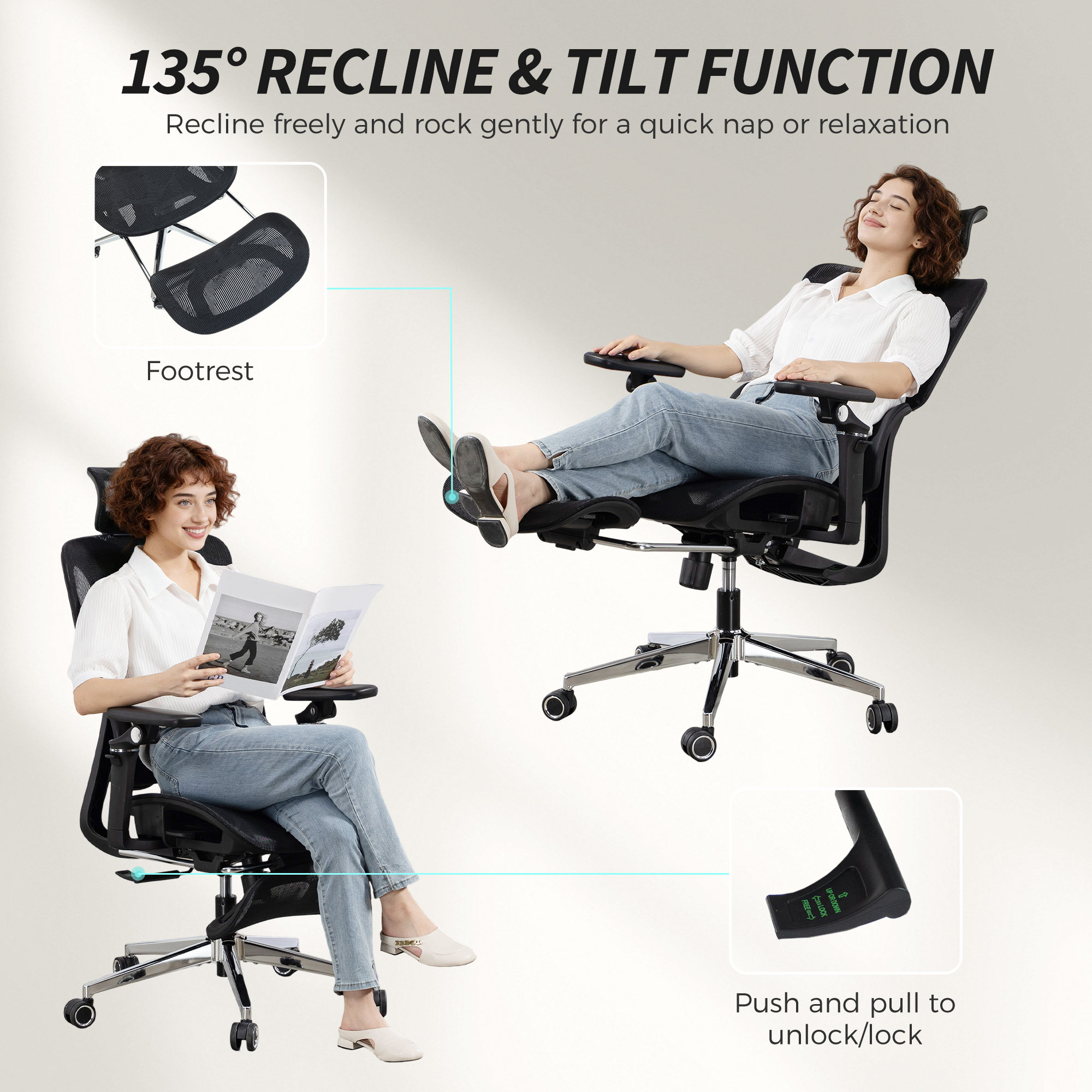 - Recline up to 135° with footrest for optimal relaxation