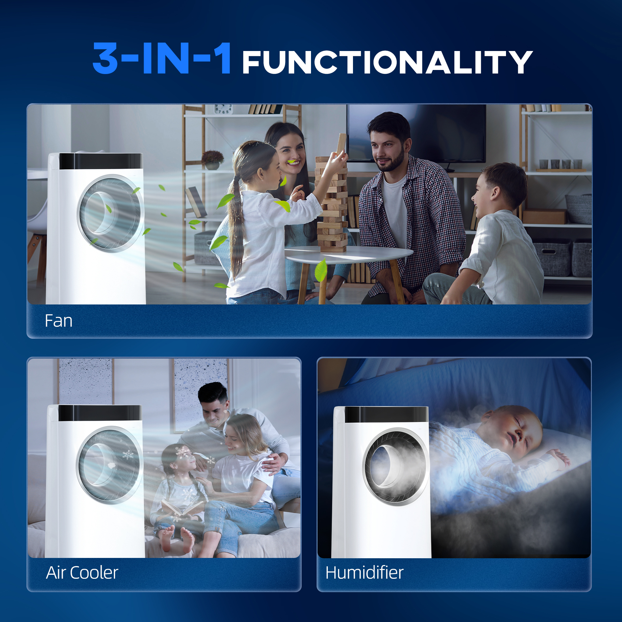 - Three functions: fan, air cooler and humidifier