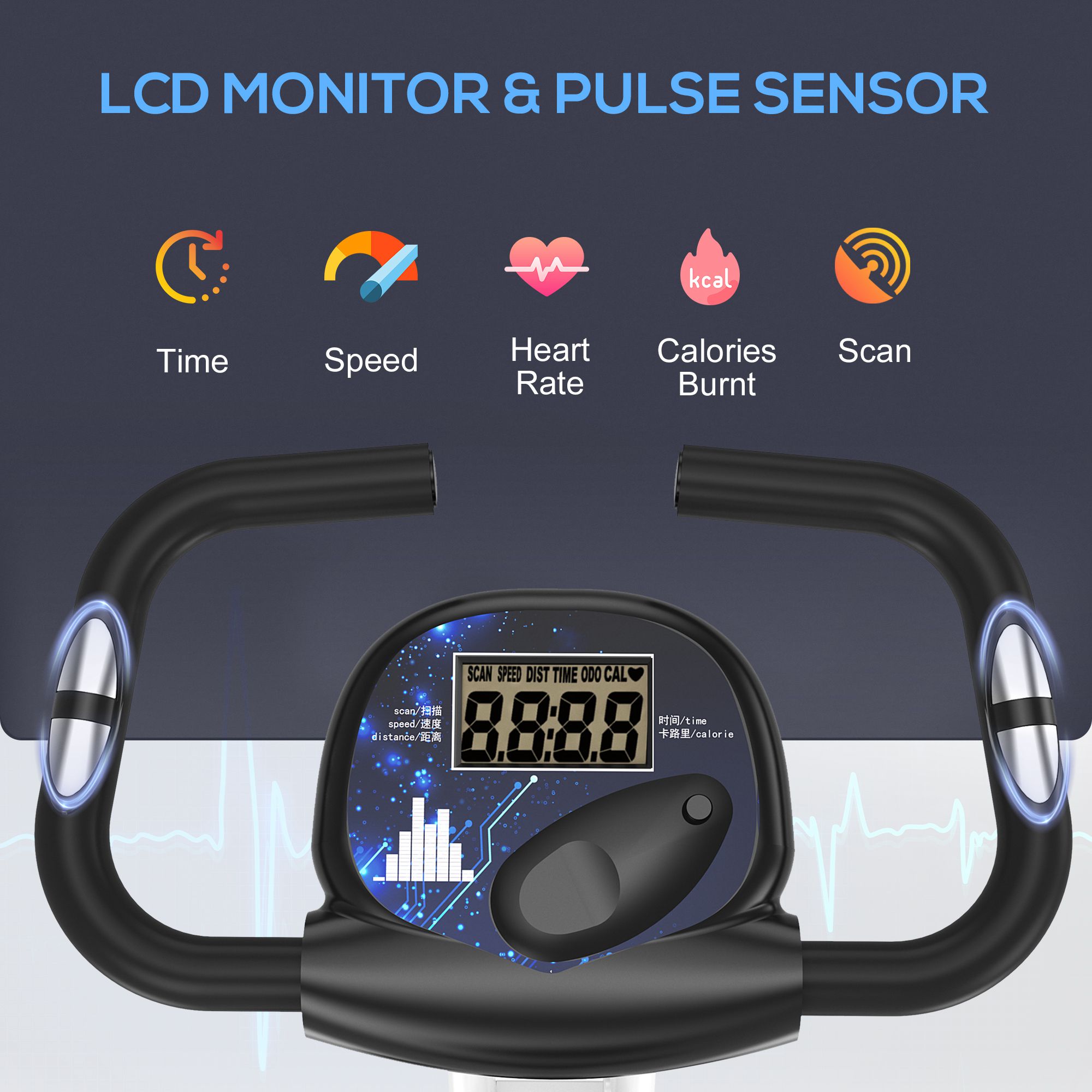 - LCD monitor displays the time elapsed, your heart rate (when hands are placed on the metal detecting panels), speed, distance and calories burnt (2 x AA batteries required, not included)