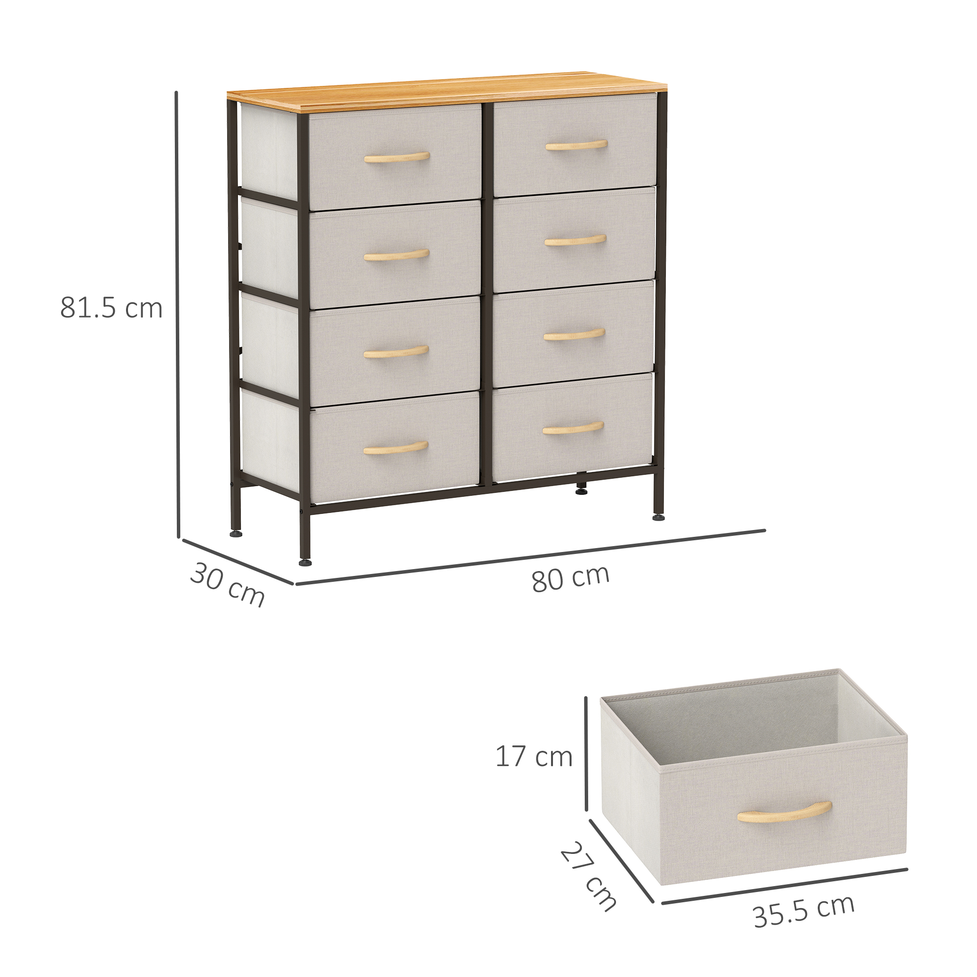 Home storage with this HOMCOM fabric chest of drawers. The eight fabric drawers offer room for lots of things - keep t-shirts, tops, bottoms and more organised. The wood-effect top offers more room: a great place to display your favourite photos. The steel frame makes a strong core, with adjustable feet for balance. Comes with anti-tipping straps for safety. Use all over the home and office.