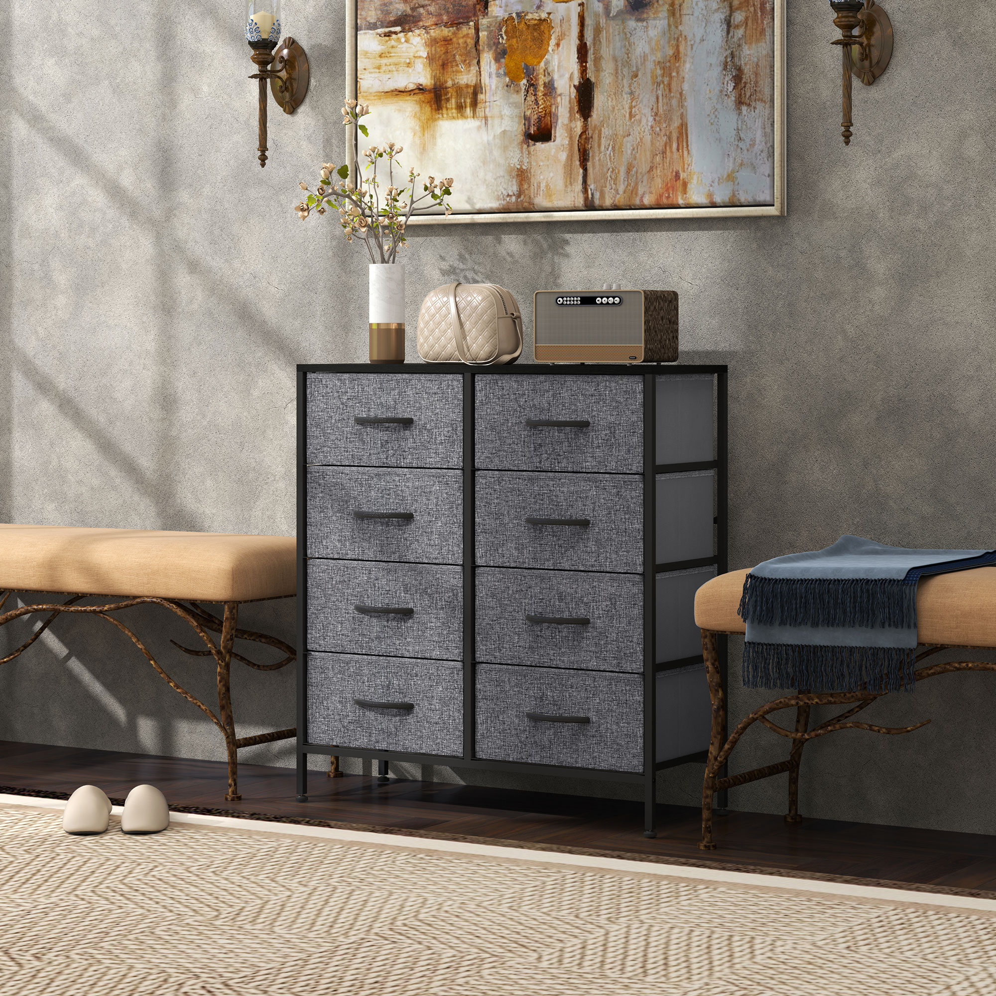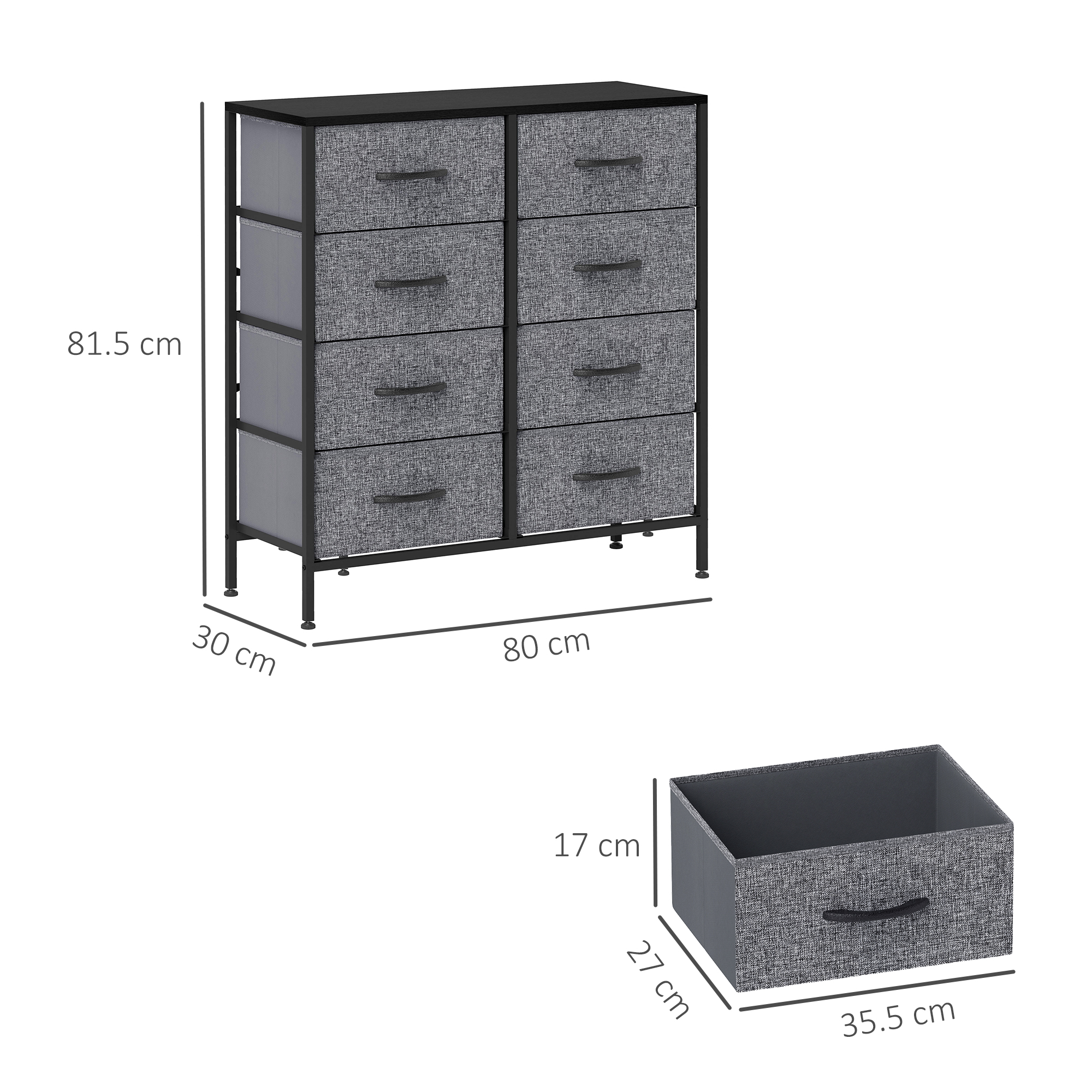 Home storage with this HOMCOM fabric chest of drawers. The eight fabric drawers offer room for lots of things - keep t-shirts, tops, bottoms and more organised. The wood-effect top offers more room: a great place to display your favourite photos. The steel frame makes a strong core, with adjustable feet for balance. Comes with anti-tipping straps for safety. Use all over the home and office.