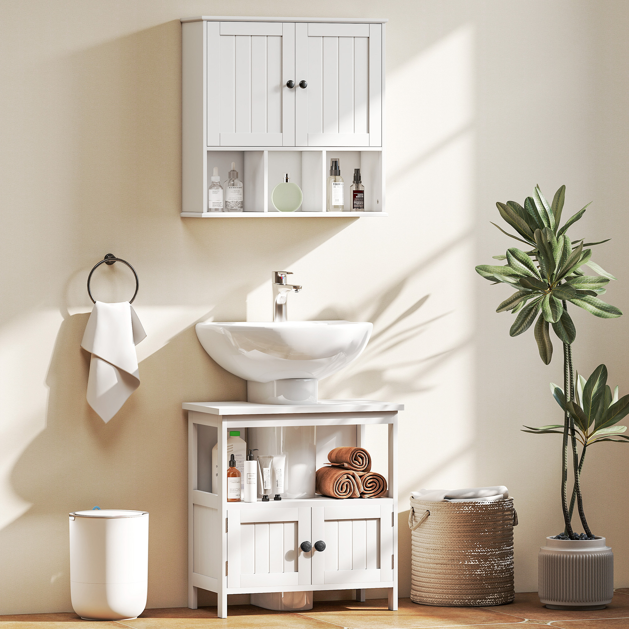 Discover the charm of farmhouse elegance with the HOMCOM bathroom wall cabinet. Its beadboard doors and classic detailing add a timeless touch, while the flexible storage options, including a double-door cabinet, three open compartments and an adjustable shelf, keep your essentials tidy and accessible. Mount the storage cupboard on the wall to save space and bring structured grace to your bathroom.