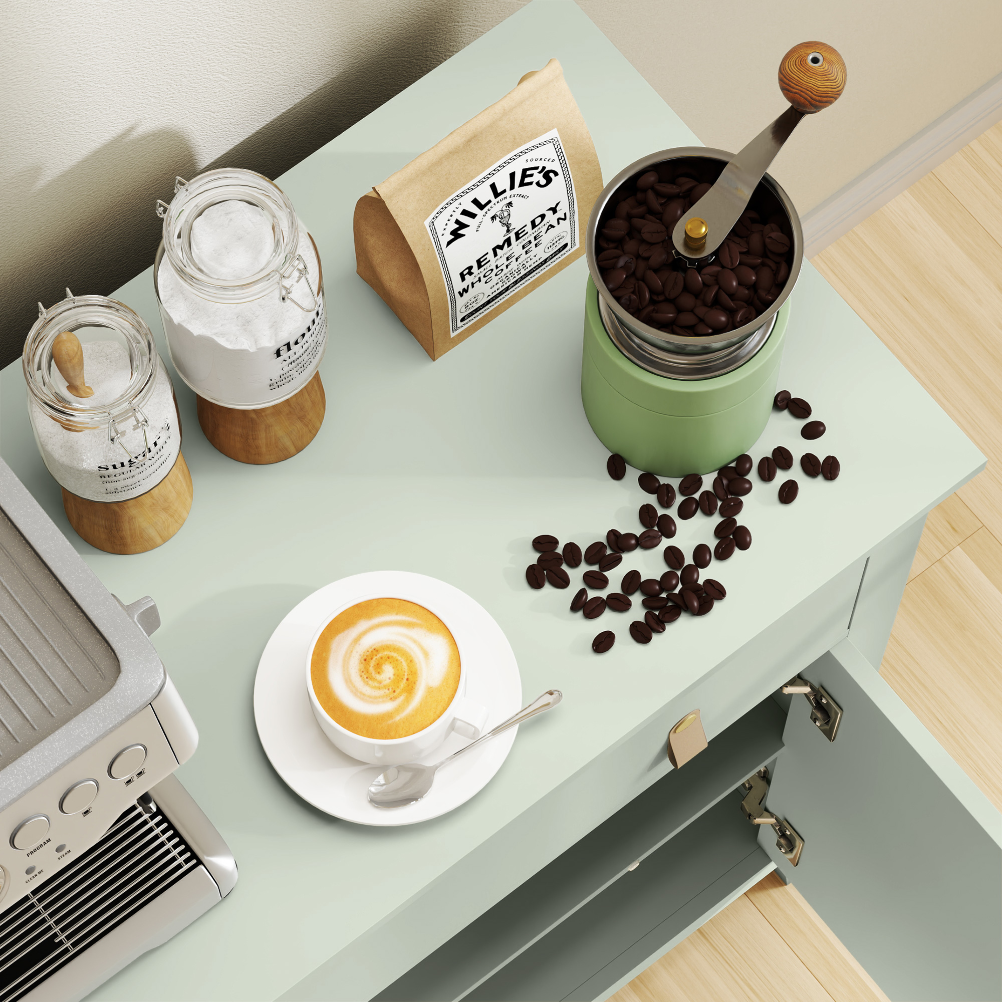 - Features a drawer, two-tier cupboard and flat top. Plenty of storage