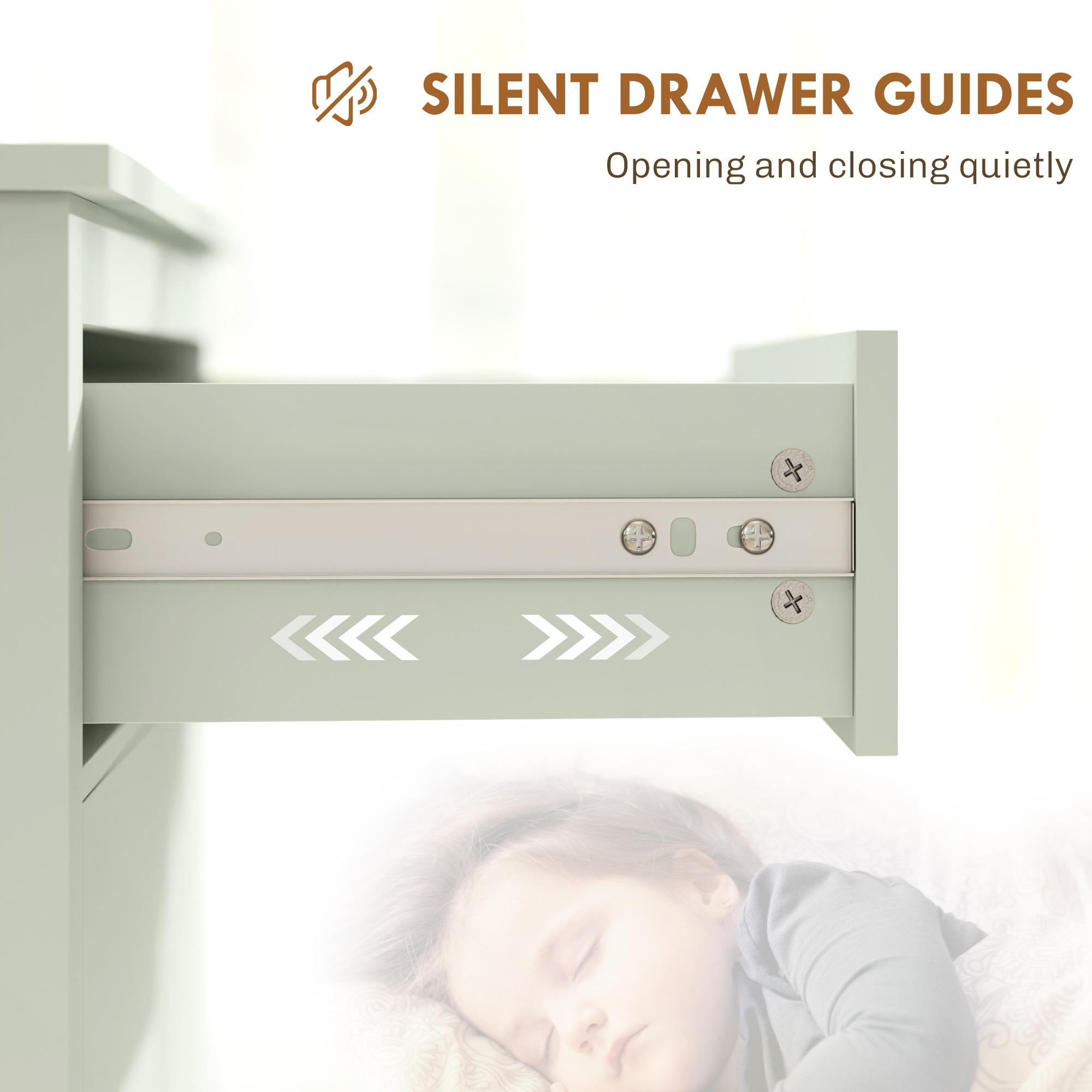- Silent drawer guides for quiet opening and closing