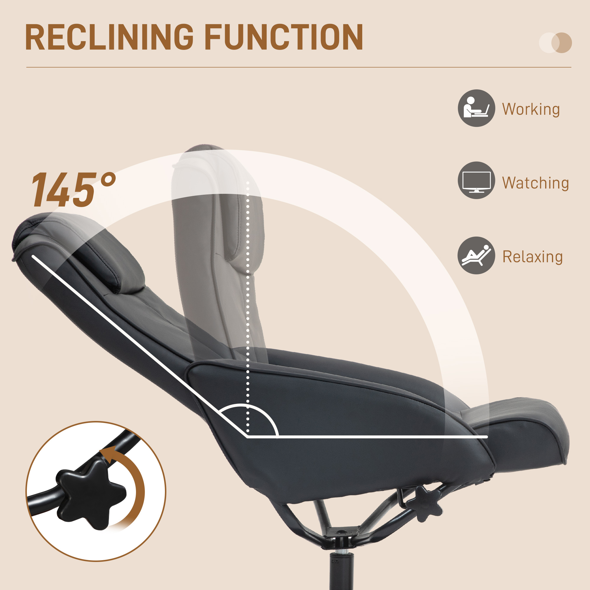 - Chair back reclines to a maximum 145° angle
