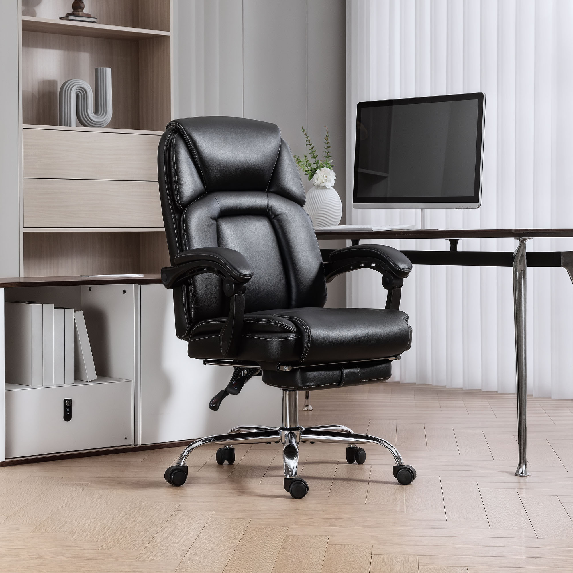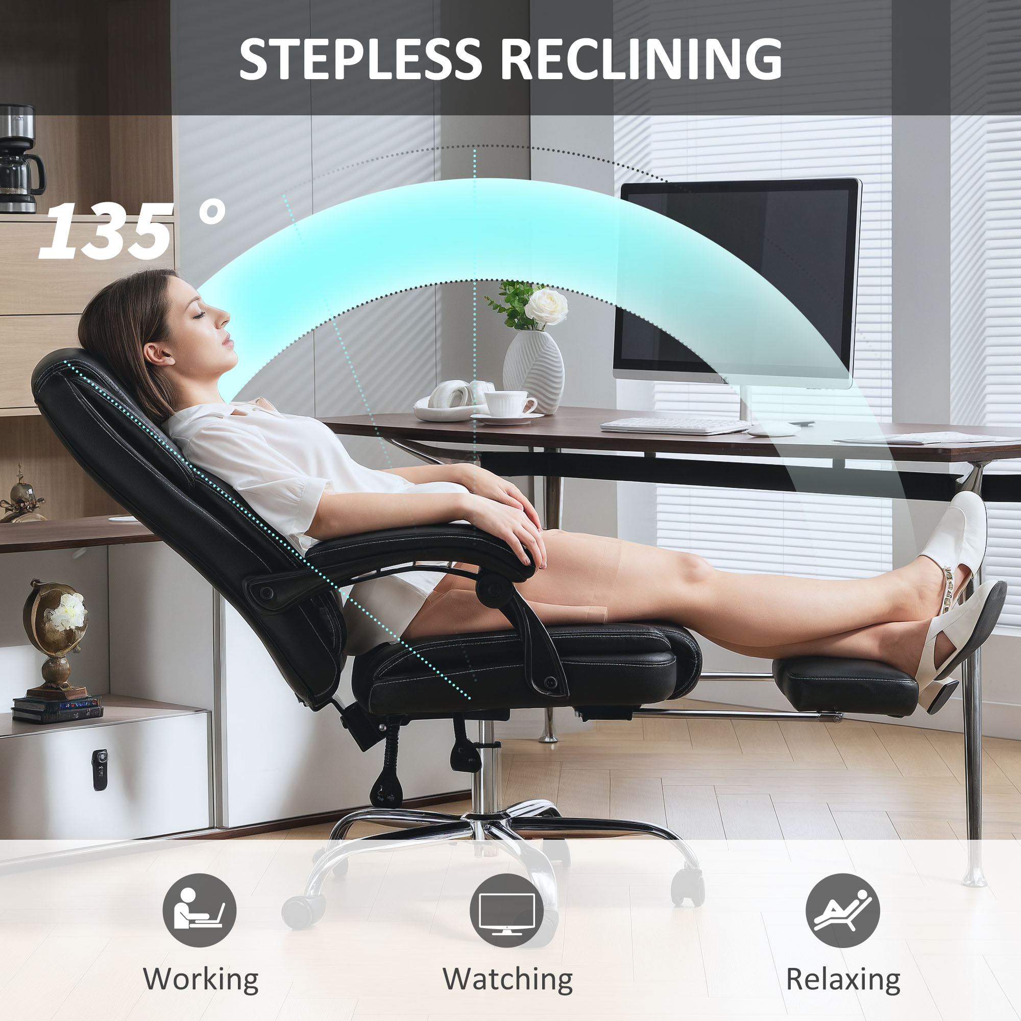 Long work days need a comfortable place to sit - so you can focus fully. This HOMCOM executive office chair does exactly that. Filled with plush, cloud-soft cushion, it is spring filled for comfort which retains shape - a seat you can use every day. It's wrapped in smooth, water-resistant faux leather upholstery: a sleek and easy-to-maintain piece.