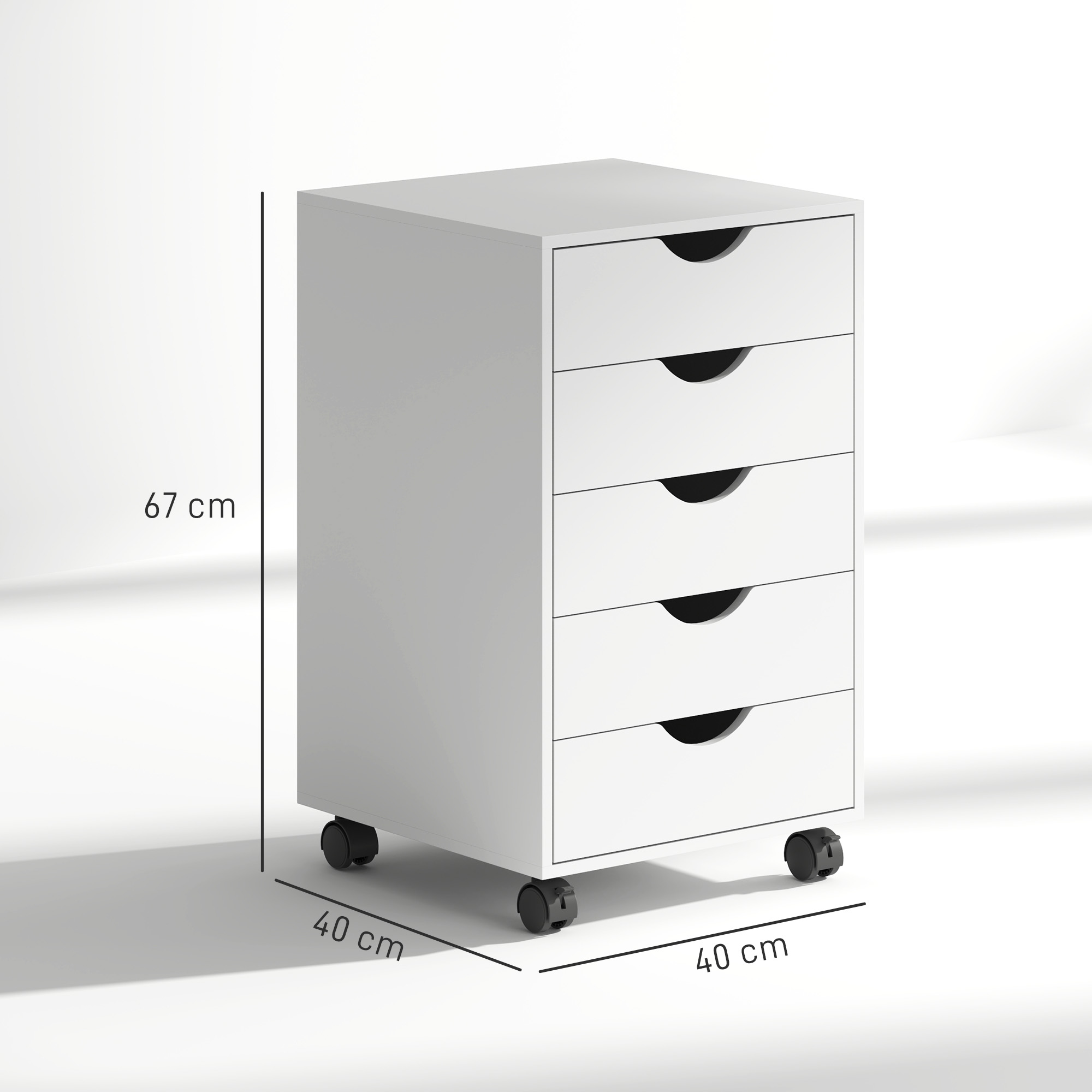 This HOMCOM filing cabinet makes office storage effortless. It features five drawers, providing plenty of room to organise files and other essentials. Made from robust MDF, it's built for everyday use. The pure white design is a bold and beautiful design - you'll having it in your office! Finished with four wheels to move around easily, with two brakes so it stands in place.