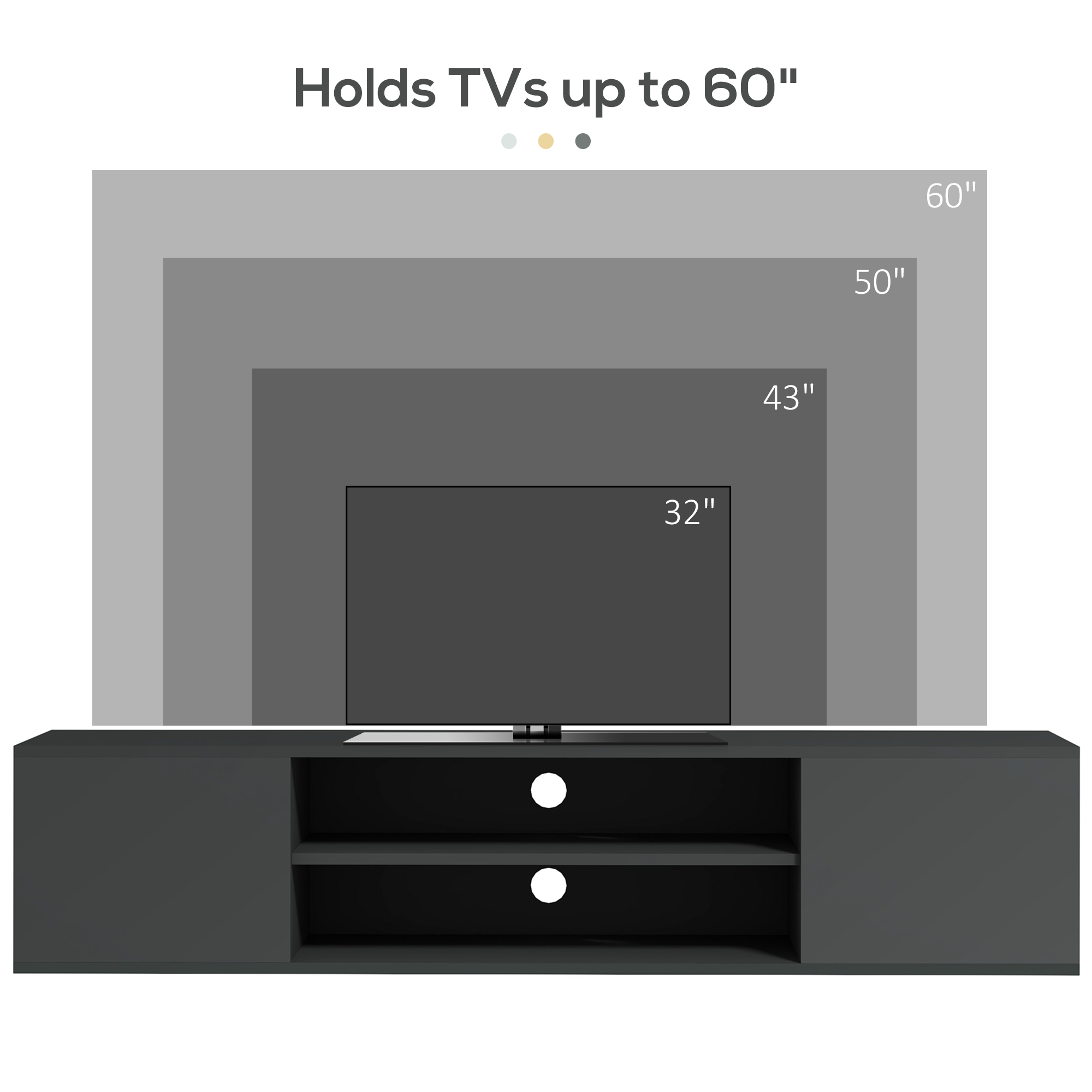 A modern, floating centrepiece for your living room: this HOMCOM TV unit brings a cool feel to your home. Attach to the wall securely to start placing your screen and more on it. Comes with two cabinets and two middle shelves for plenty of storage. Made from particle board, this tv unit is durable and tough, covered in a sleek and modern high gloss finish. Complete with handy cable holes on the back.