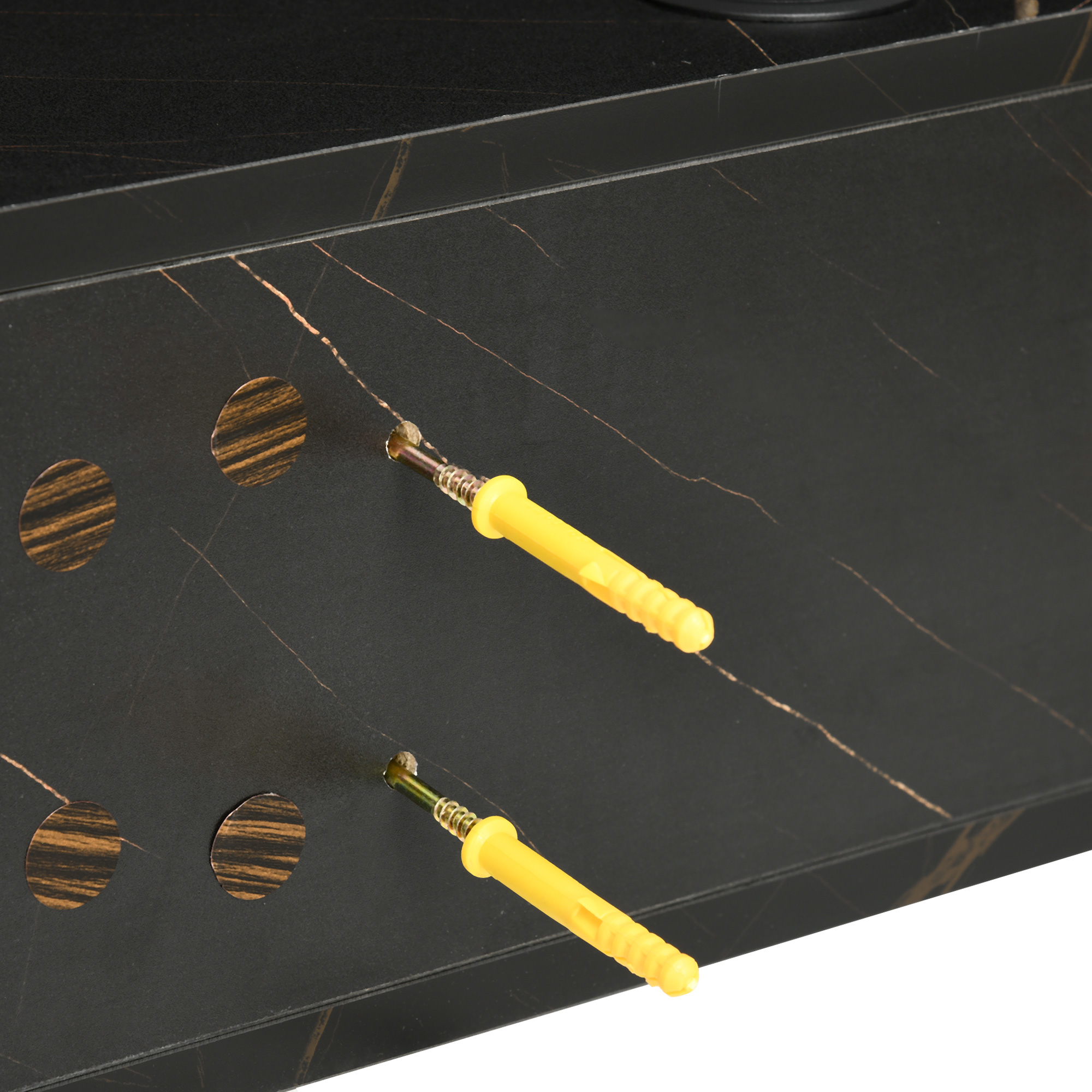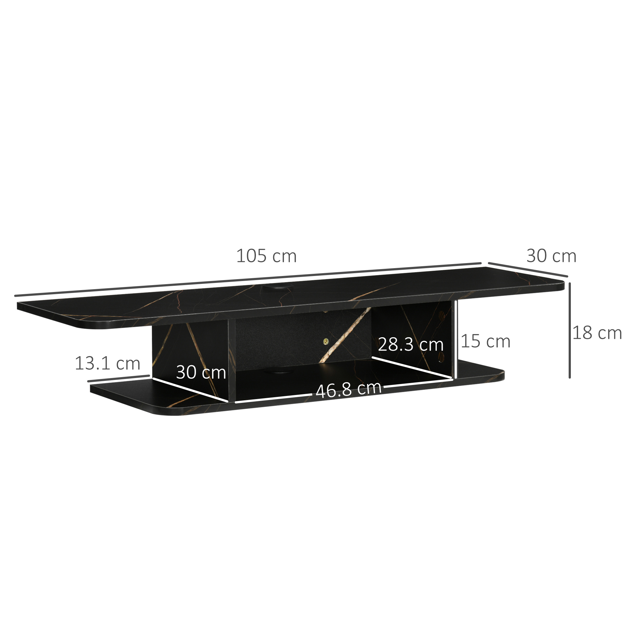 Make your space modern with this floating TV shelf, from HOMCOM. The wall-mounted design means no floor space is taken, with cable holes on the back to keep wires together and mess-free. Made from particle board, this unit is durable, with a protective melamine coating. It has a spacious middle shelf for storage; the smaller side shelves and table top offer extra display room.