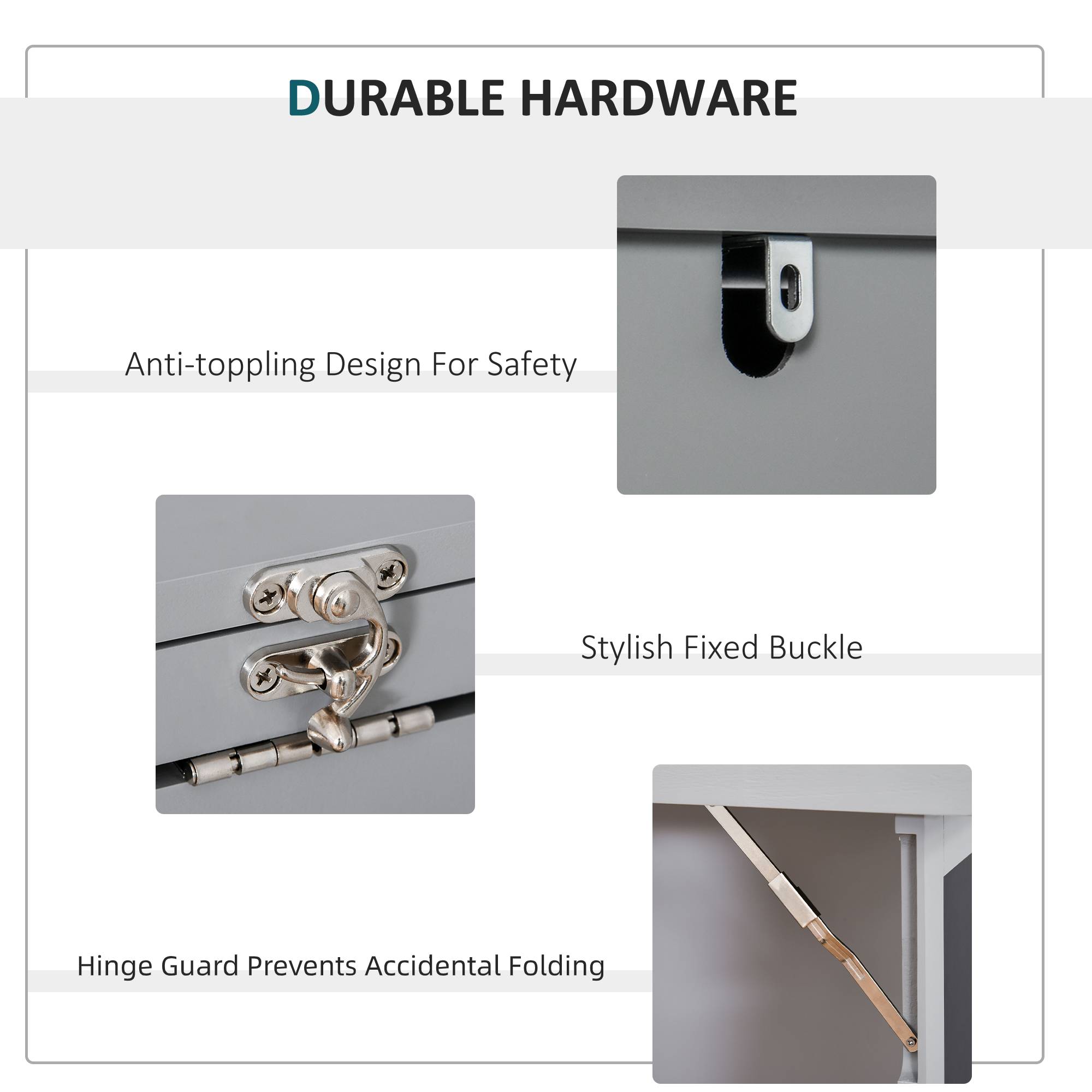 - Solid particle board structure, with metal hardware to reinforce strength