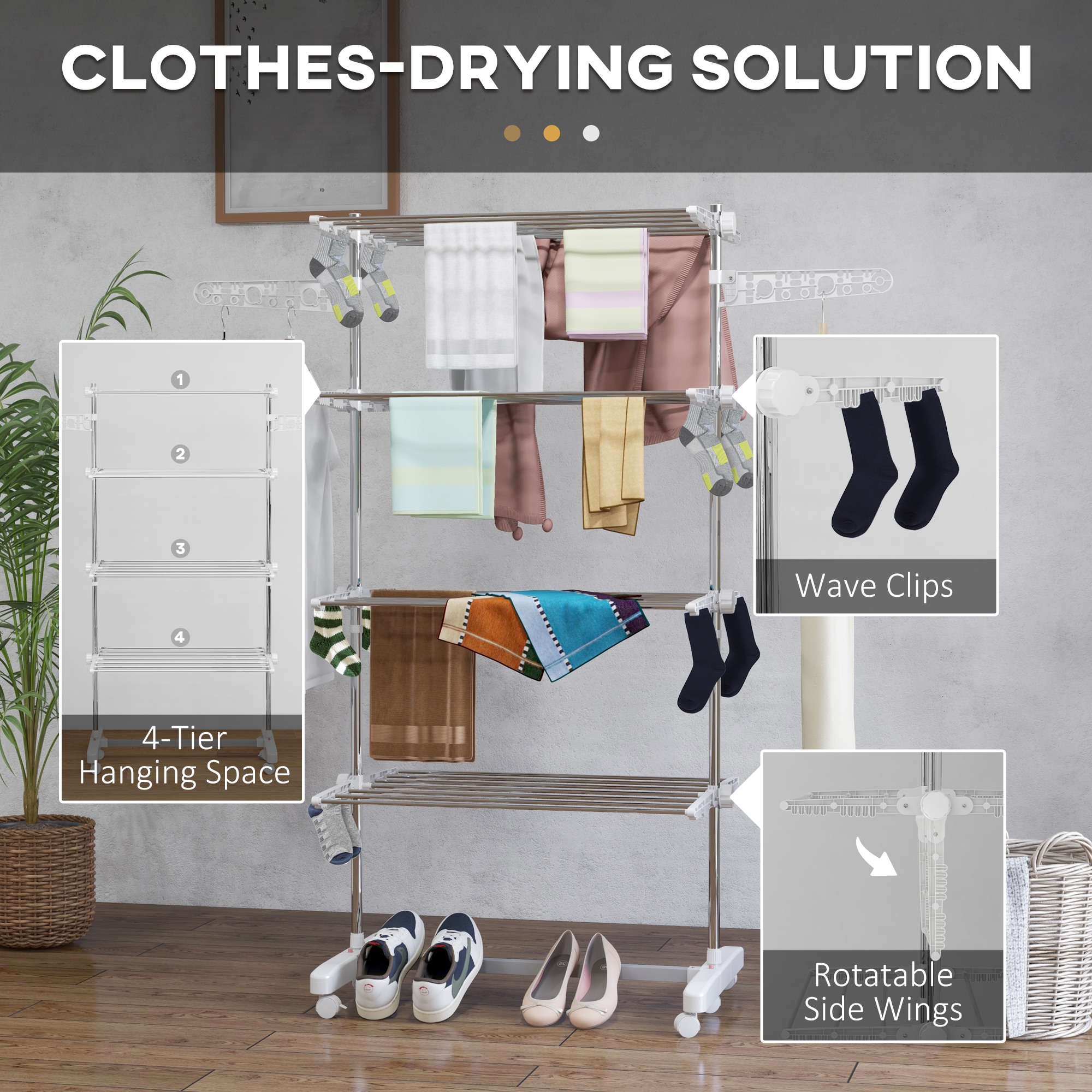 Easy clothes drying, with plenty of just-washed items thanks to this HOMCOM clothes horse. The multi-rack design comes with four middle shelves and two rotating wings: plenty of room for clothing. All levels, plus the legs, can be moved downwards/inwards to ensure it can be compactly stored. Six wheels to move it around easily, this laundry rack comes with two brakes so it stands stationary in place.