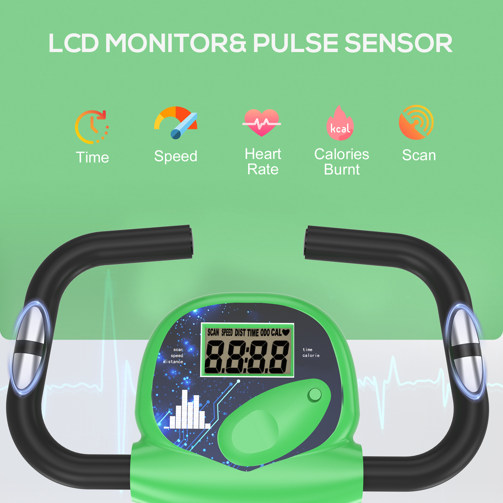 - LCD monitor displays the time elapsed, your heart rate (when hands are placed on the metal detecting panels), speed, distance and calories burnt (2 x AA batteries required, not included)