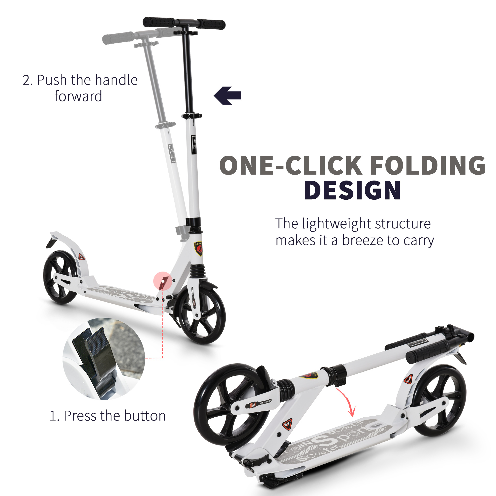 Ride around with this kick scooter from HOMCOM. The kick scooter adult frame is stable yet lightweight. It is crafted into an innovative folding design, allowing the commuter scooters to be opened and closed quickly. Adjustable from 90 cm to 105 cm, the 2 wheel scooter's handlebar is able to comfortably suit a wealth of heights. It is finished with a rear-wheel fender braking system, ensuring not only is this scooter safe to ride on, but it is also both safe and fun.