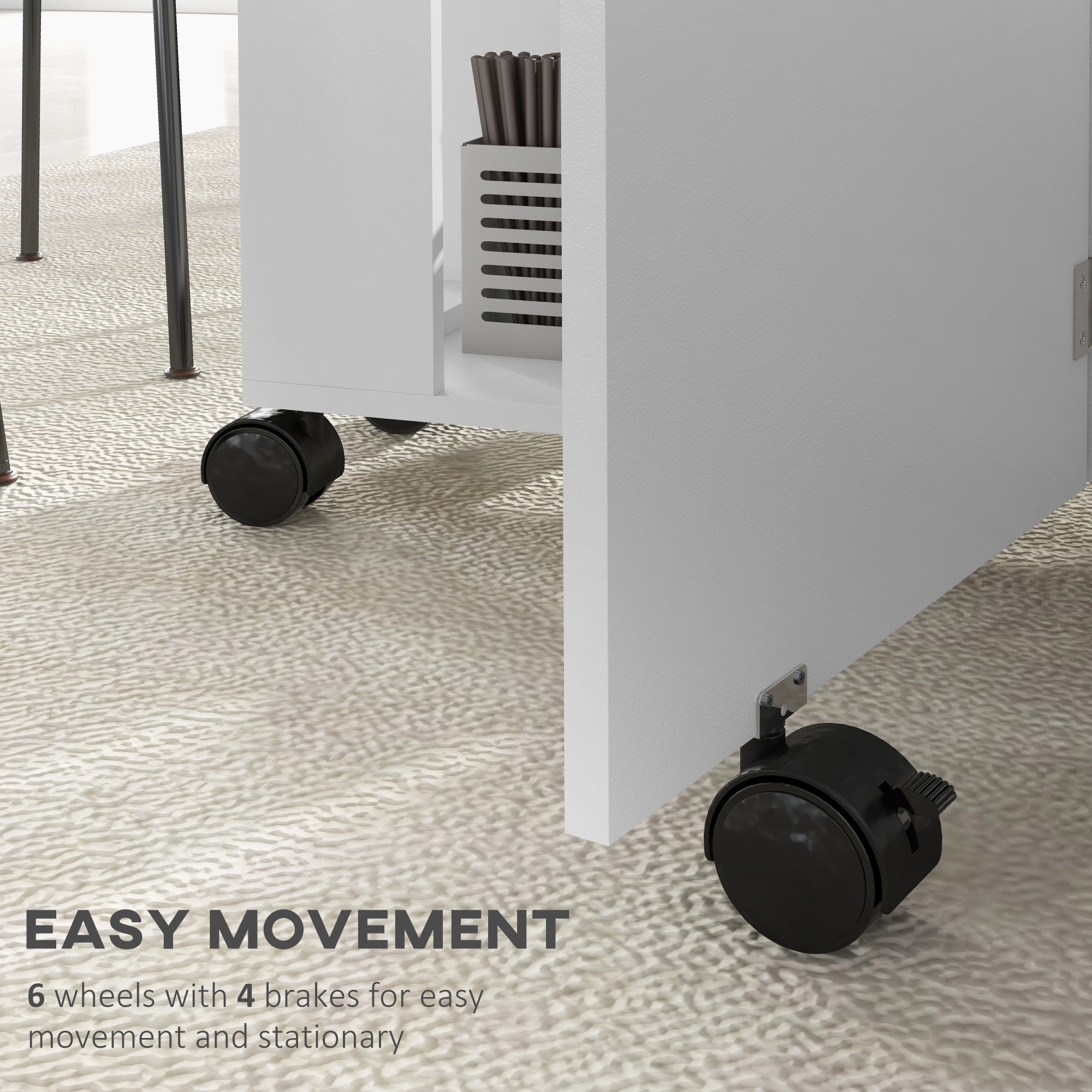 - Six wheels with four brakes to move around easily