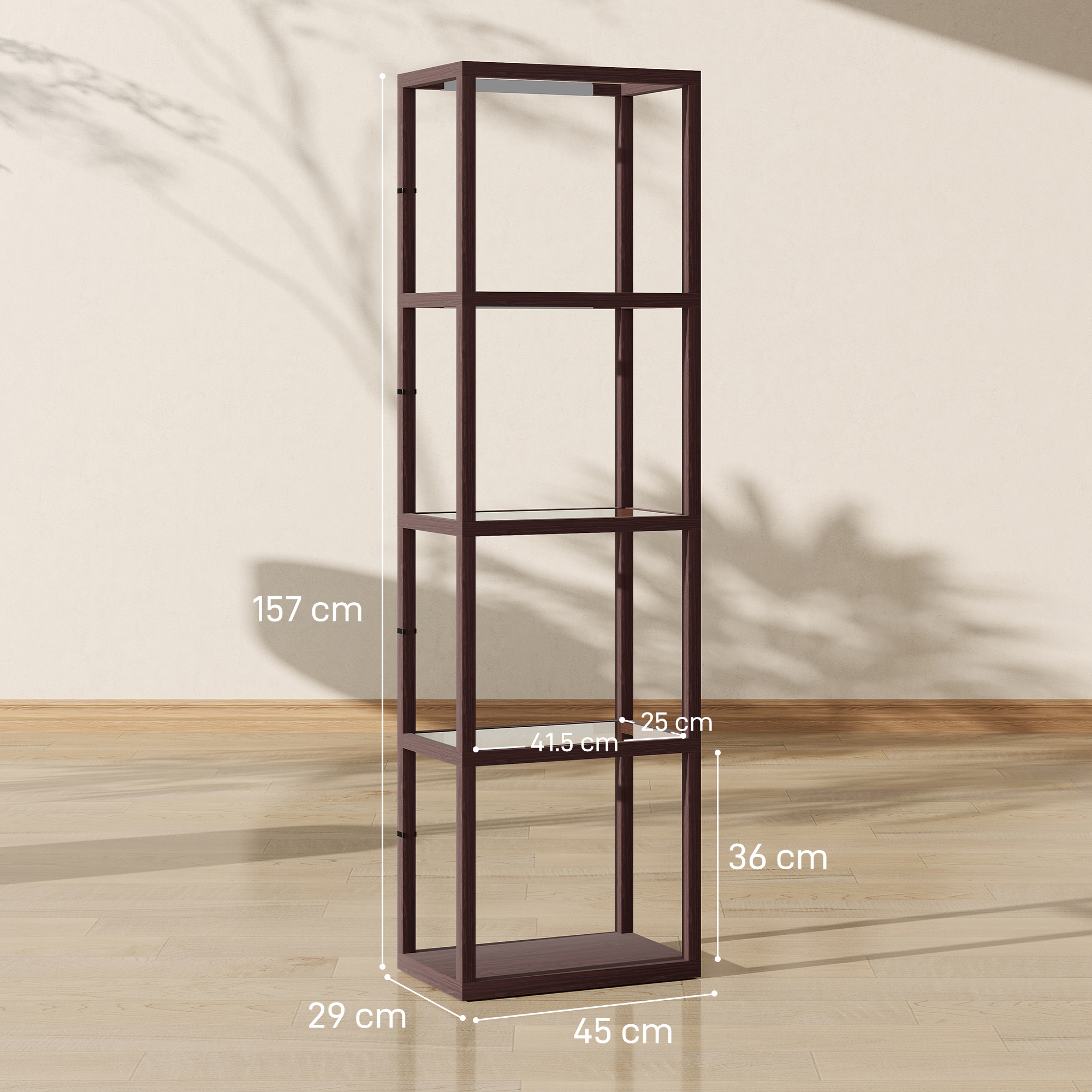 - Four shelves offer space for holding favourite decorations, books and more