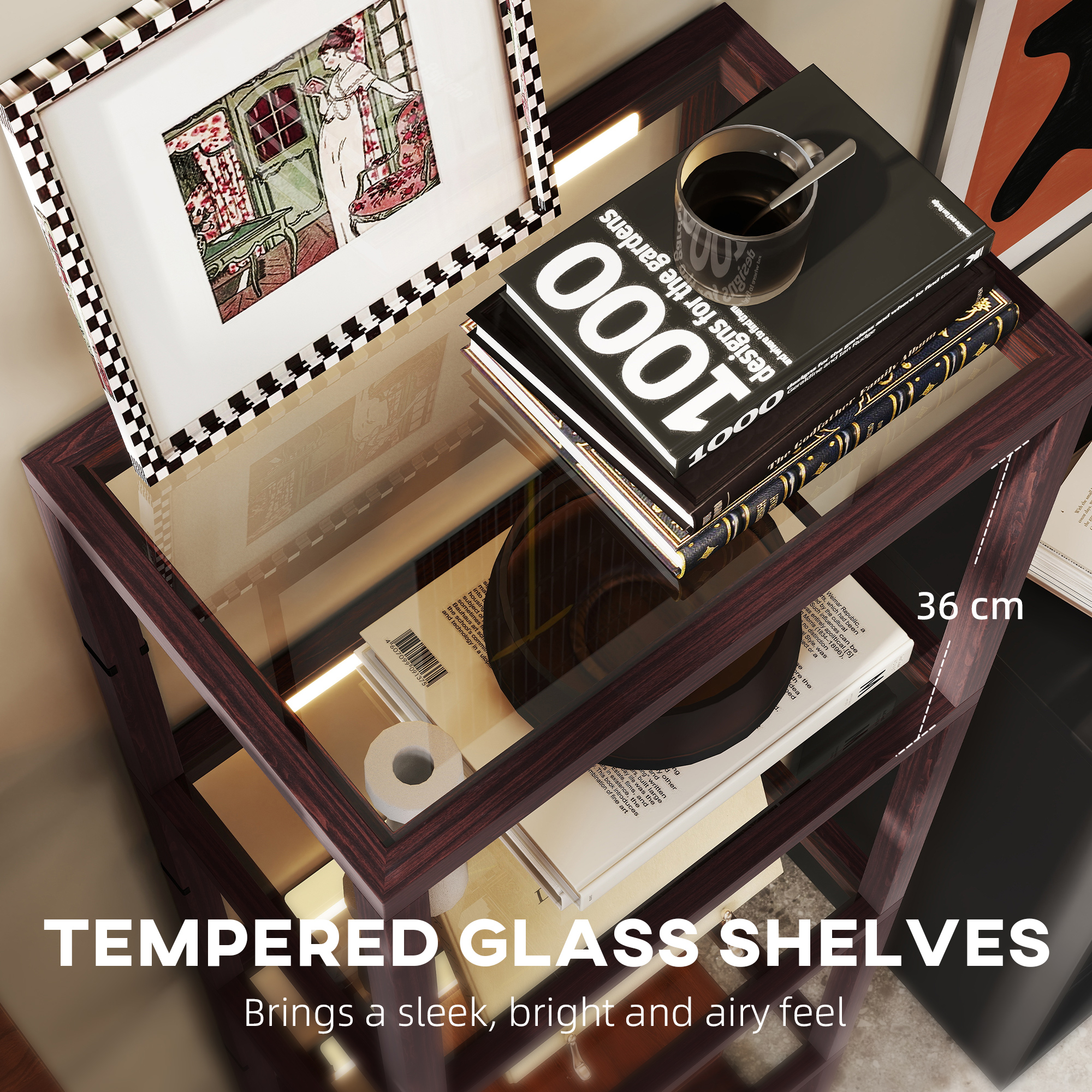 - Tempered glass shelves allow the light to pass through, for light from top to bottom