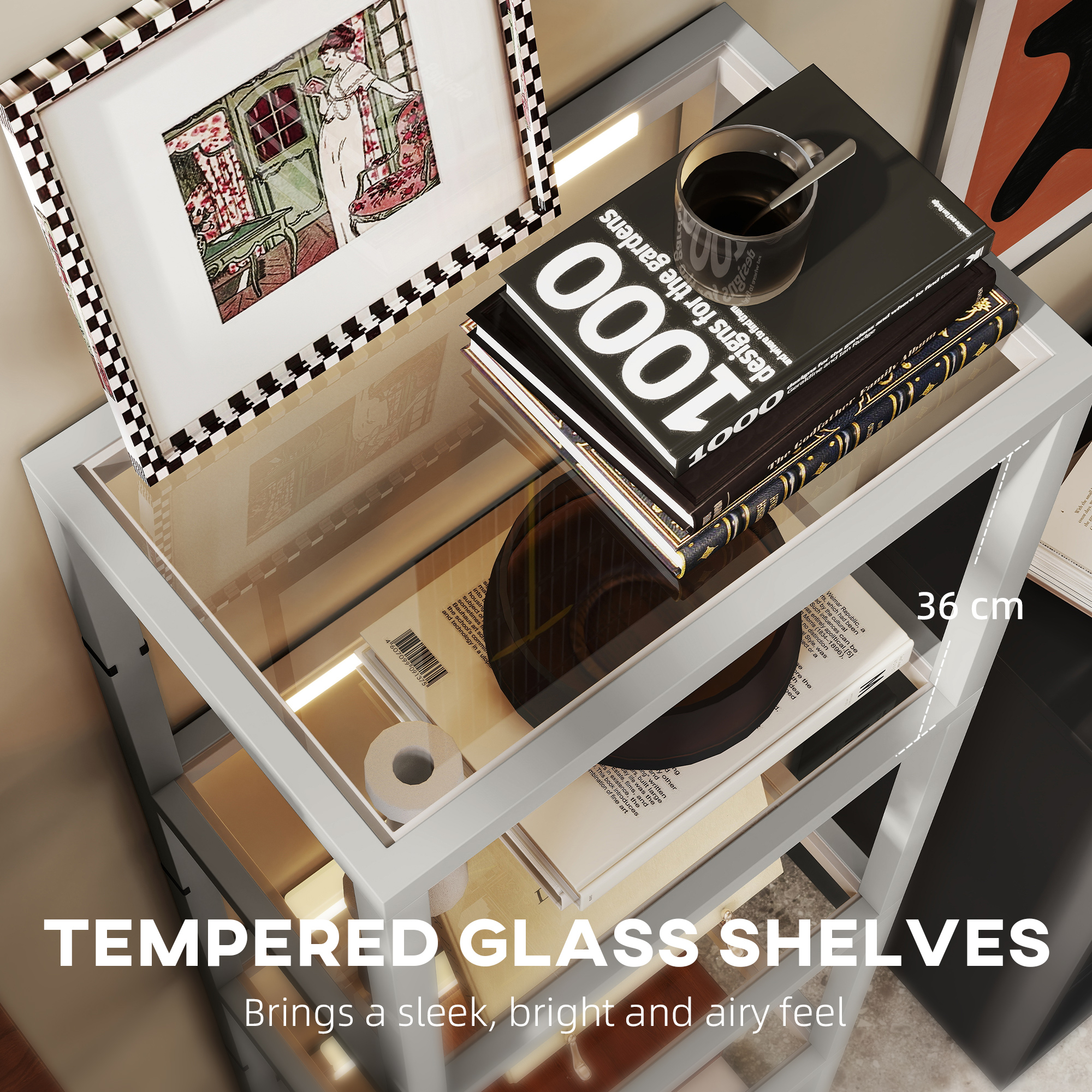 - Tempered glass shelves allow the light to pass through, for light from top to bottom