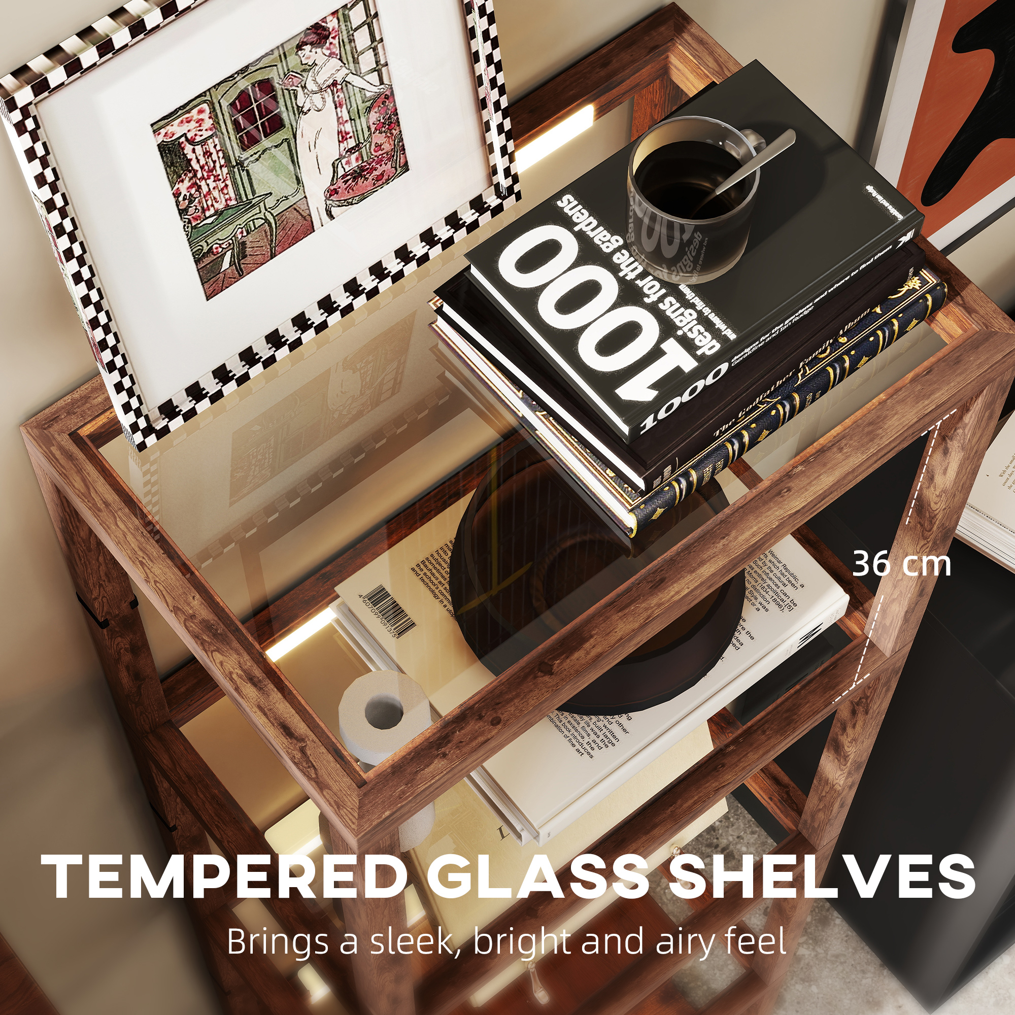 - Tempered glass shelves allow the light to pass through, for light from top to bottom