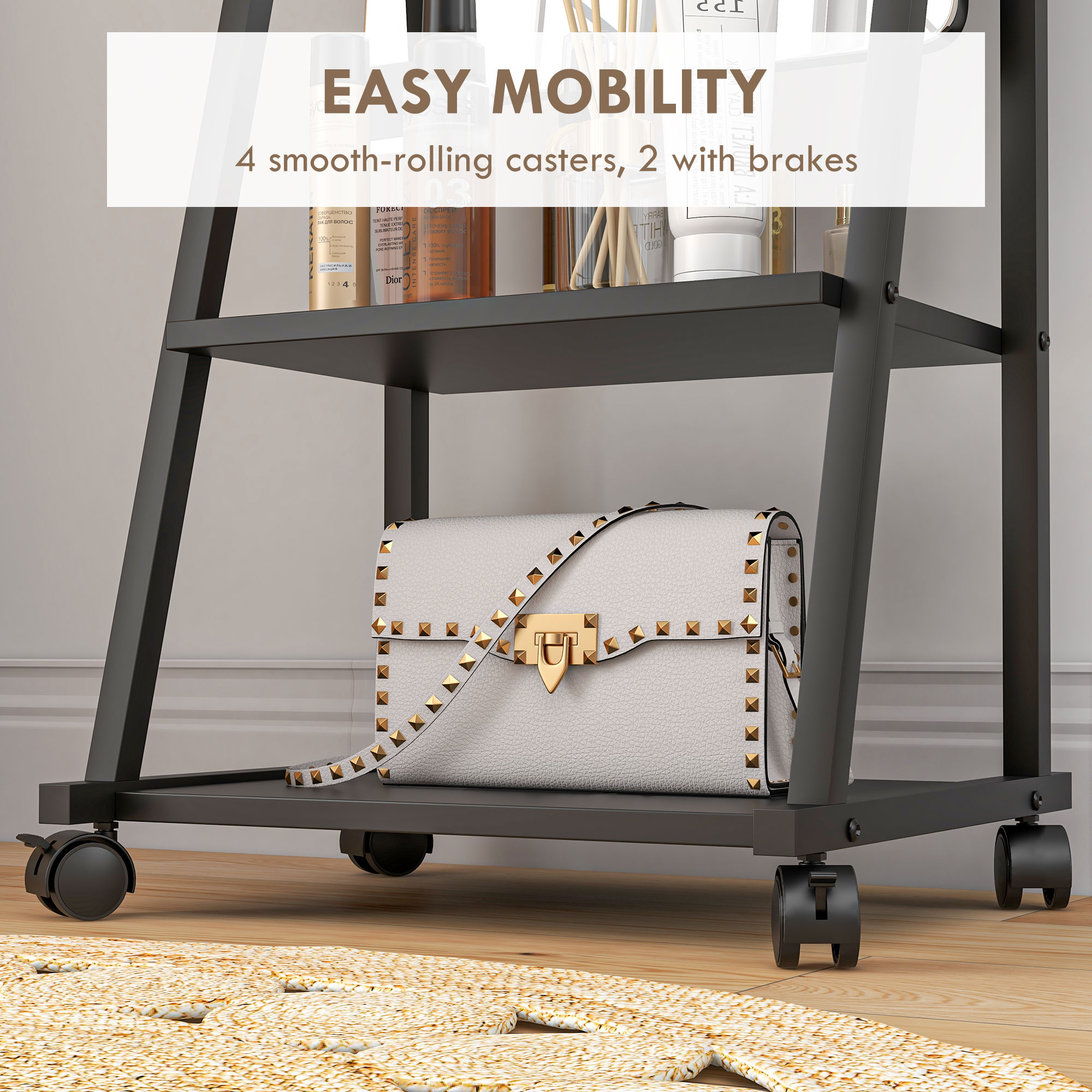 - Four wheels to move easily. Two brakes to stand steady