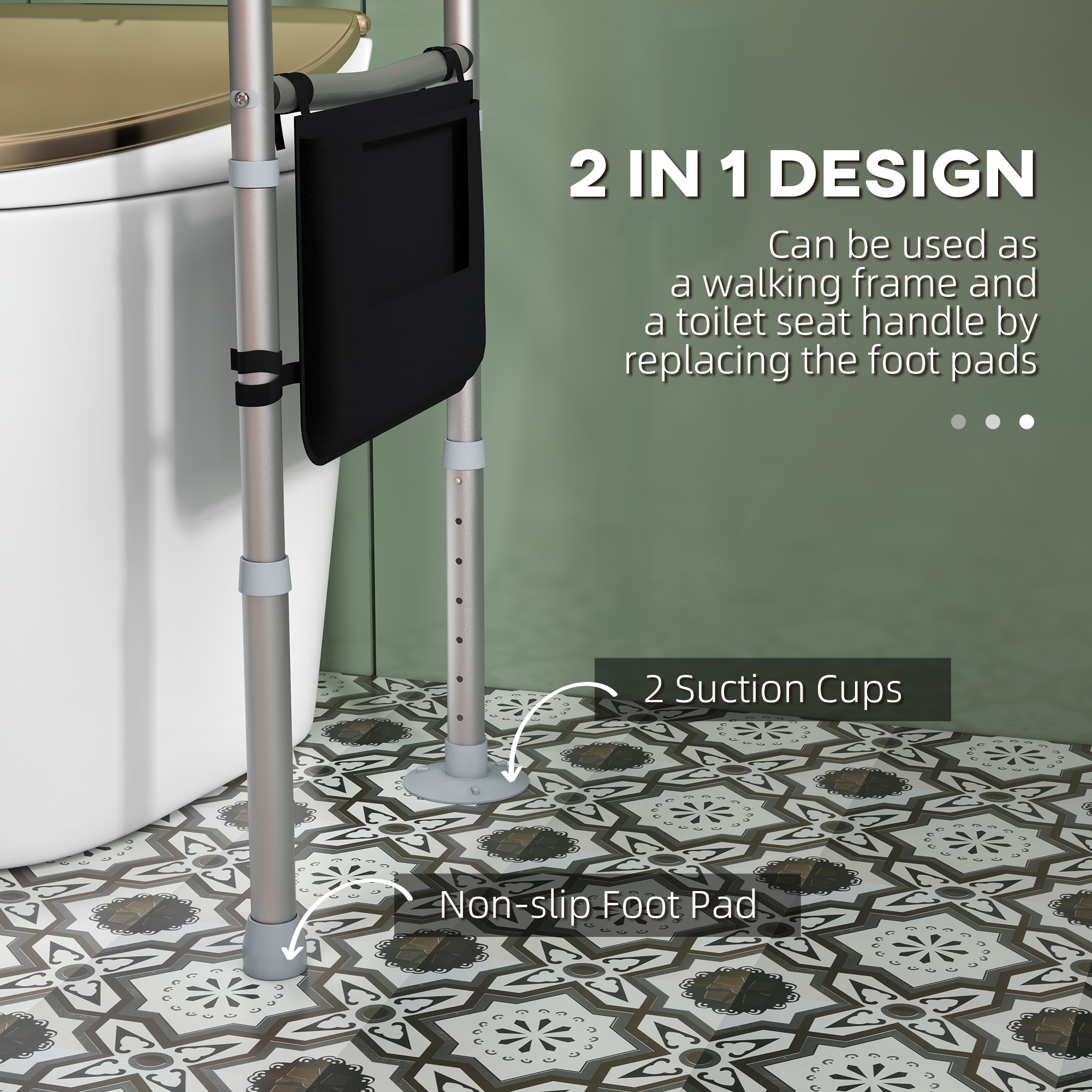 - Convertible for walking or toilet use by switching foot pad type